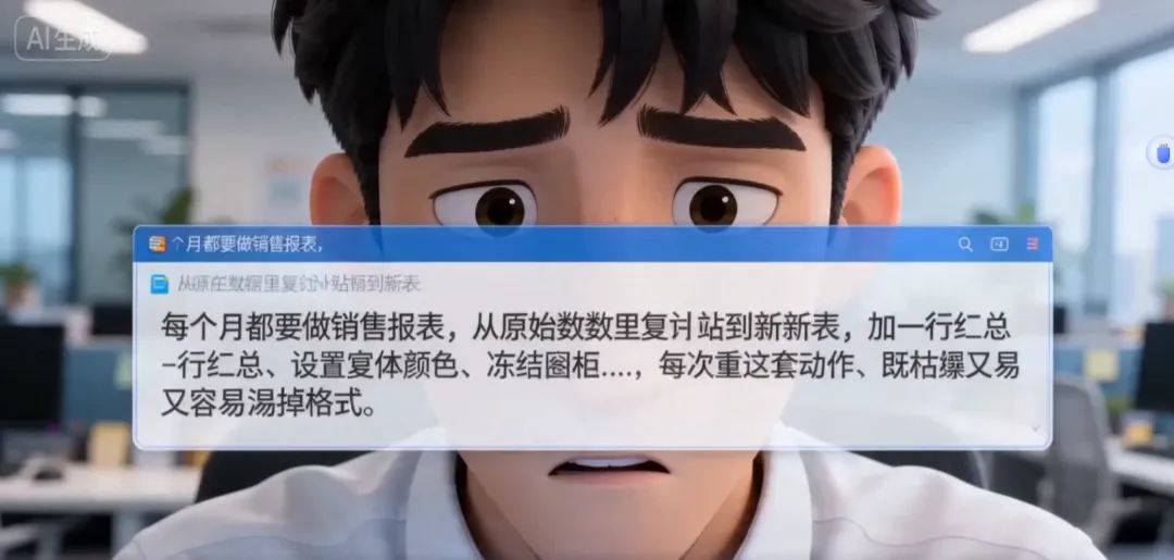 上周财务部的小刘找我吐槽:每个月都要做销售报表,从原始数据里复制粘贴到新表,加一行汇总,设置字体颜色、边框、冻结窗格……每次重复这套动作,既枯燥又容易漏掉格式。
