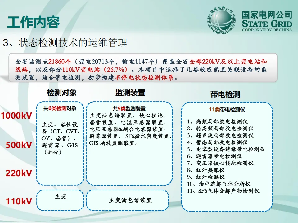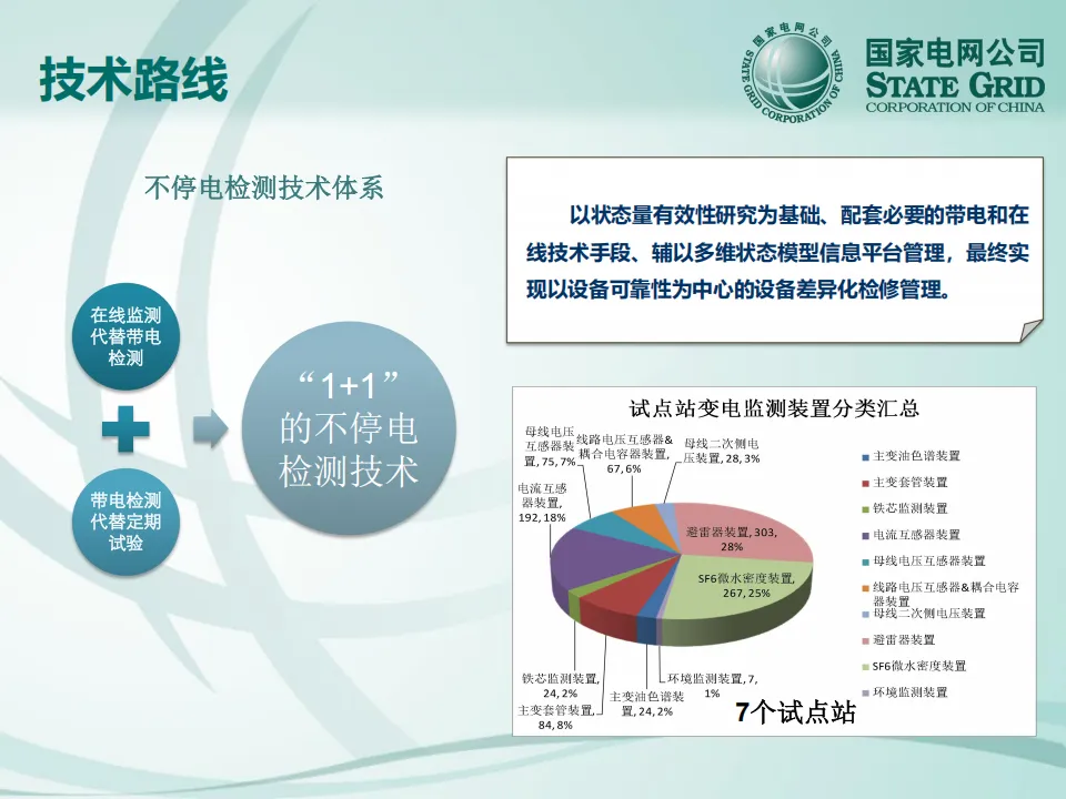 项目提出了"1+1"不停电检测技术体系:在线监测代替带电检测,带电检测代替定期试验,构建了以"状态量有效性研究为基础、配套必要的带电和在线技术手段、辅以多维状态模型信息平台管理"的创新路线。