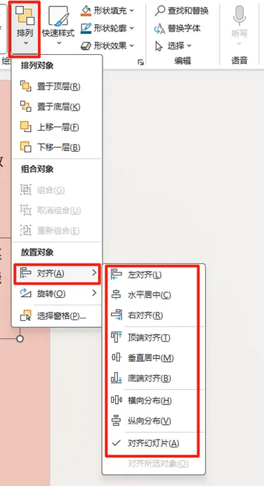 点击对应的选项,瞬间就能让元素整齐对齐,再也不用手动一点点调位置啦。整齐的元素排列会让 PPT 页面看起来更加专业、舒适。