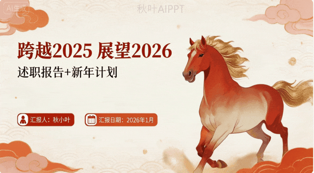 【留白排版】16:9比例,左右分栏:右侧放红马(占40%),左侧为文字区(占50%),底部预留2个按钮位置,视觉平衡不拥挤。