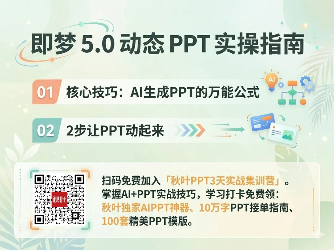 领取方式非常简单:扫码免费加入《秋叶 PPT 3 天实战集训营》,学习打卡即可直接抱走秋叶独家 AIPPT 神器。