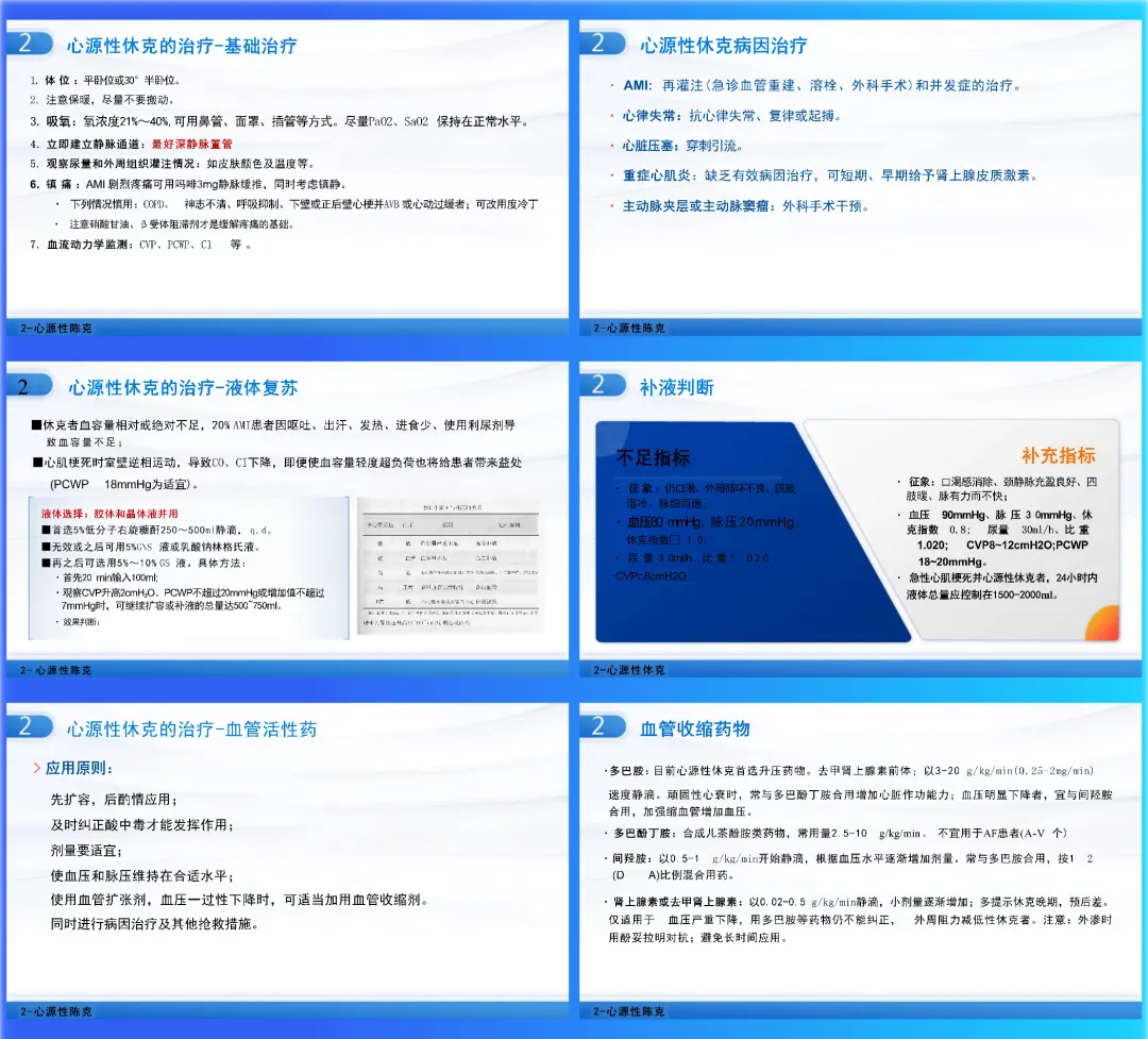 系统阐述治疗策略:包括基础治疗、病因治疗、以CVP/PCWP为指导的精细液体复苏、血管活性药物与正性肌力药物的选择与应用、以及IABP等机械辅助治疗。