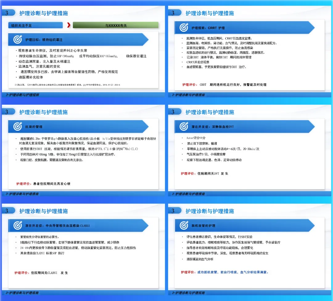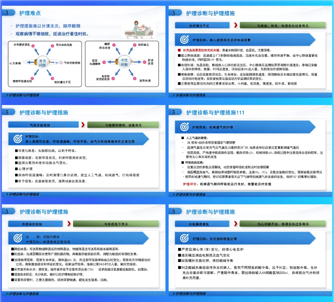 课件设计采用递进结构,旨在建立系统性照护框架。首先回顾休克的一般规律与微循环变化,夯实病理生理基础;然后聚焦心源性休克,深入其独特病因、发病机制、诊断标准,并引入SCAI分期以量化严重程度;最后将理论与护理实践紧密结合,围绕组织灌注不足、气体交换受损等核心问题,列出具体护理诊断与措施,并将血流动力学监测、IABP、CRRT等高级支持技术的护理要点融入其中。逻辑清晰,目标明确。