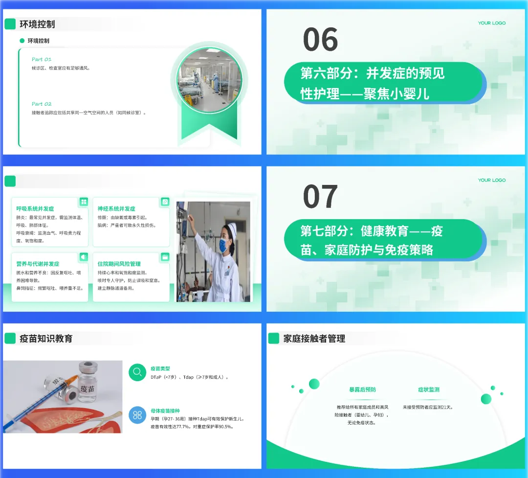 本课件设计遵循临床认知与防控实践双主线。首先,从疾病概述与病原学切入,明确当前“百日咳再现”的流行病学新特征及中国红霉素耐药菌株高流行的严峻现状,建立危机意识。随后,聚焦于护理核心职责:如何识别各年龄段(尤其是小婴儿)的非典型表现,如何在耐药背景下配合精准诊断与治疗,以及如何基于空气传播证据执行有效的感染控制。最后,延伸至并发症预见性护理、家庭健康教育与前沿进展,形成从院内到院外、从当前实践到未来展望的完整知识闭环。核心目标是更新知识库,将最新共识转化为可执行的护理行动。