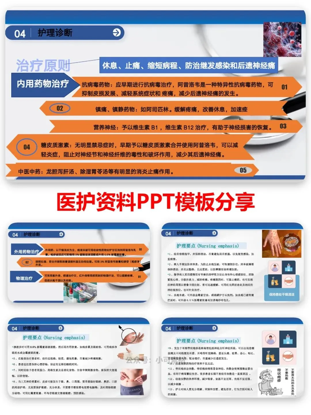 护理核心围绕止痛、护皮、防感染、控风险展开。疼痛护理优先评估疼痛程度,指导患者健侧卧位、穿宽松棉质衣物减少摩擦,配合深呼吸放松、红光照射缓解痛感,遵医嘱用普瑞巴林、甲钴胺等止痛营养神经药物。皮肤护理需保持创面干燥清洁,水疱未破涂炉甘石洗剂或阿昔洛韦软膏,破溃后用硼酸溶液湿敷、新霉素软膏抗感染,严禁抓挠与热敷,避免病毒扩散加重损伤。