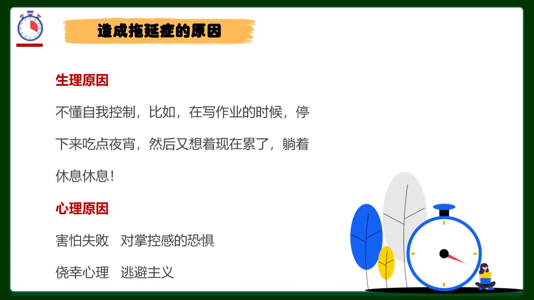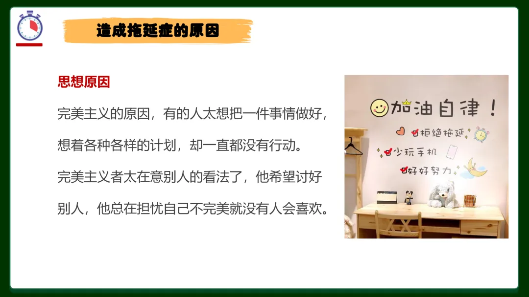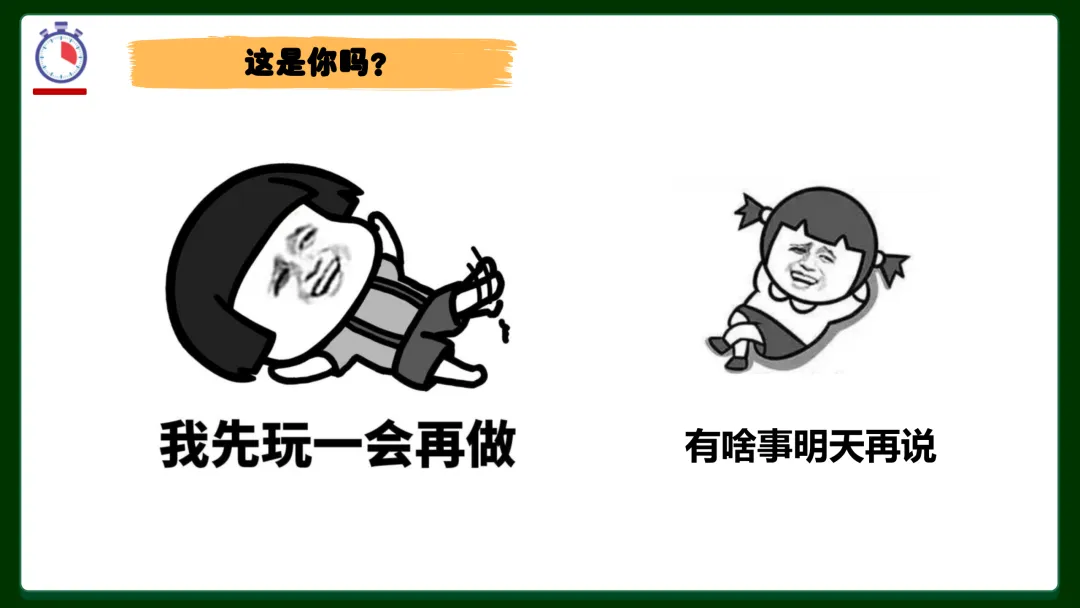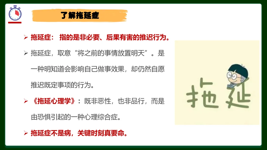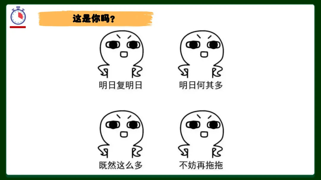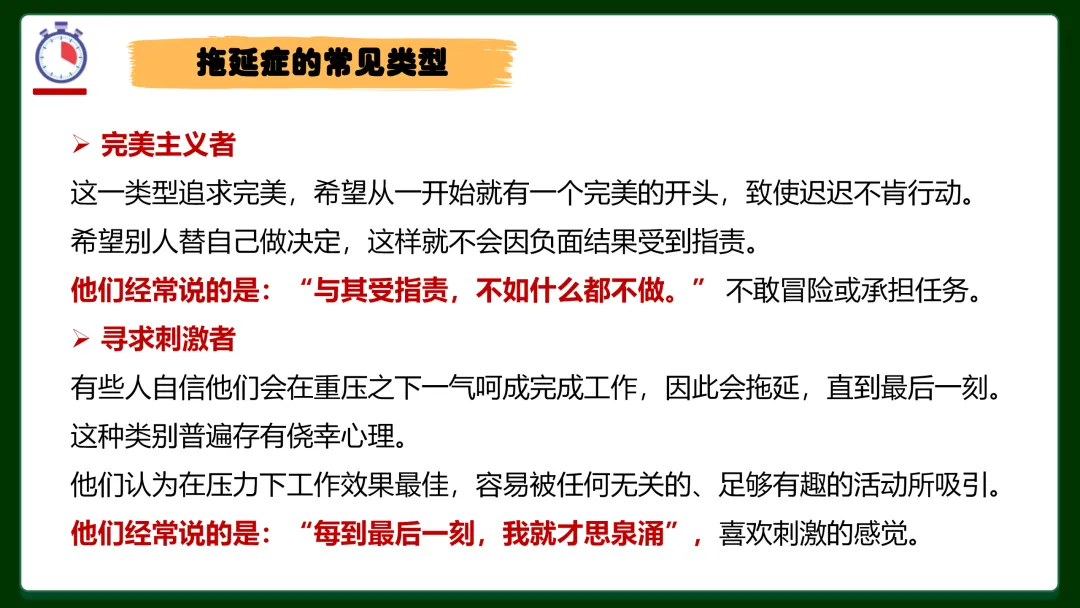 ✅ 拖延症三大型号对号入座:完美主义者——总想等一个完美开始,迟迟不动手;逃避者——害怕失败、在意别人看法,干脆不做;寻求刺激者——坚信最后一刻才思泉涌,赌徒心态害死人。你是哪一种?