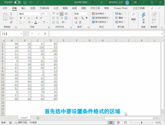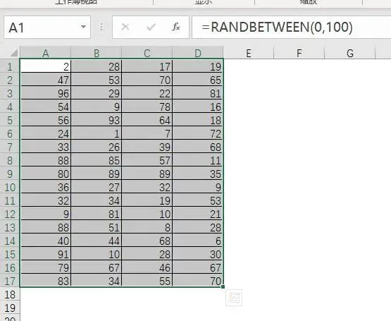 首先来看一个简单的例子,A1:D17使用了随机函数,随机生成0-100的数字。