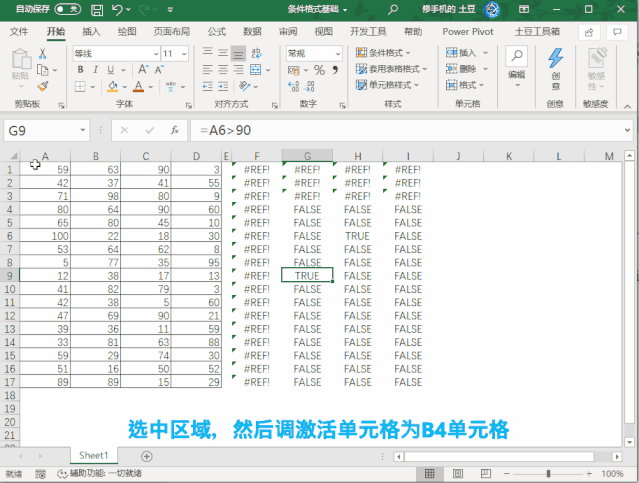 接下来是分析时间,看一下工作原理,选中F1:I17,输入=a1>90 ,按 Ctrl +Enter 填充,能看到很多 False 和 True,再和数据区域对比 ,不难看出,凡是为true的单元格,都是大于90的。看一下操作动画