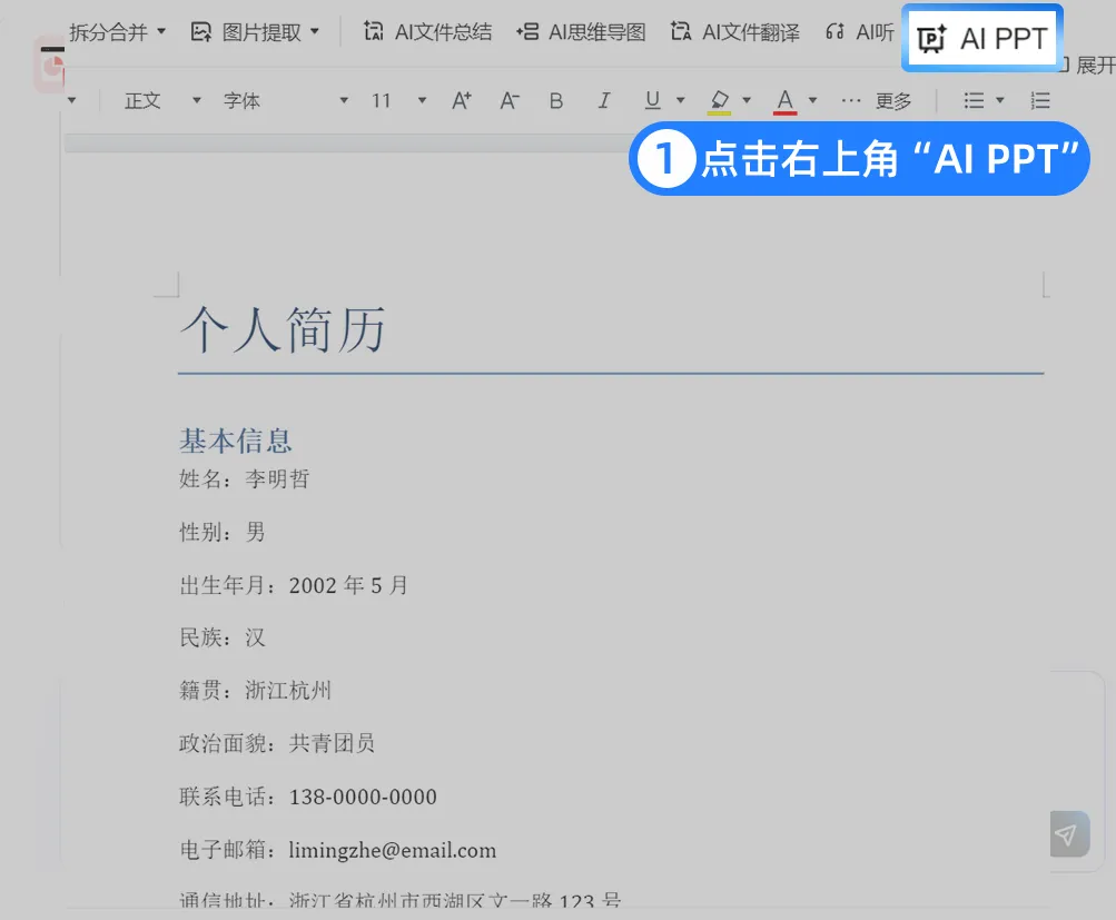 •入口二:当你在浏览器里打开任意文档(Word、PDF),点击页面顶部的「AI PPT」按钮,即可跳转到生成页面,看个文档的功夫就能快速生成PPT。