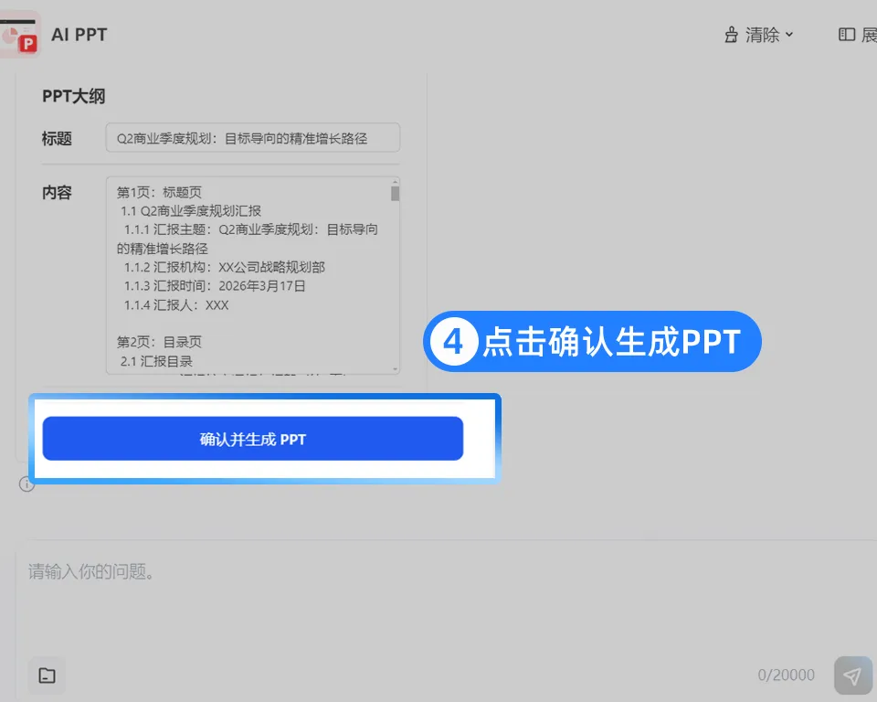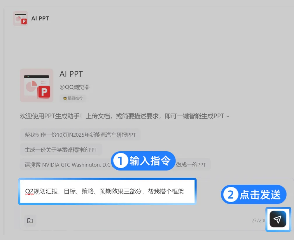 别慌,打开QQ浏览器AI小窗,输入:“Q2规划汇报,目标、策略、预期效果三部分,帮我搭个框架”。AI秒出大纲:目标页、策略页、预期效果页……逻辑顺了,排版有了,5分钟快速搞定一份PPT!