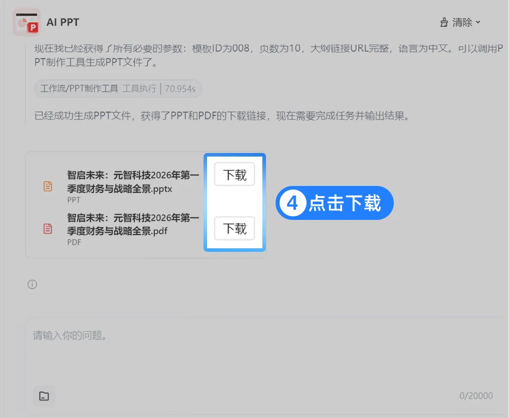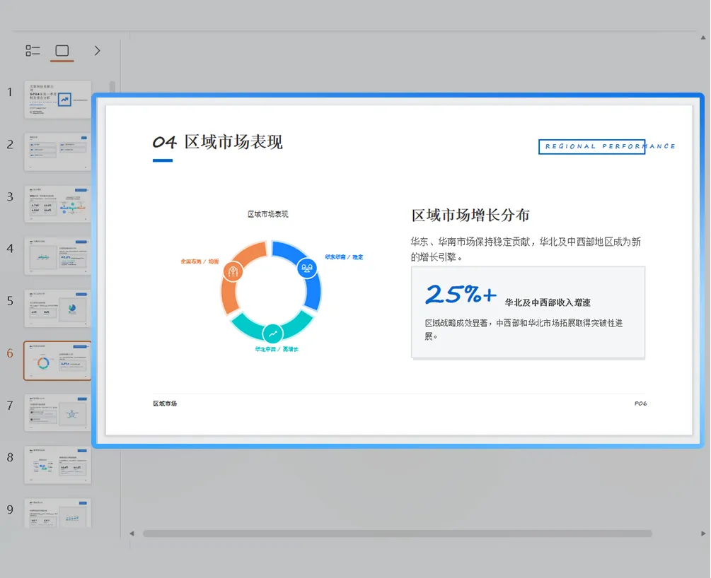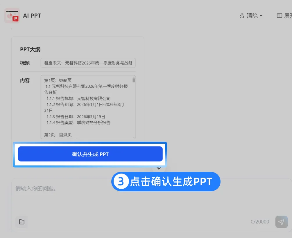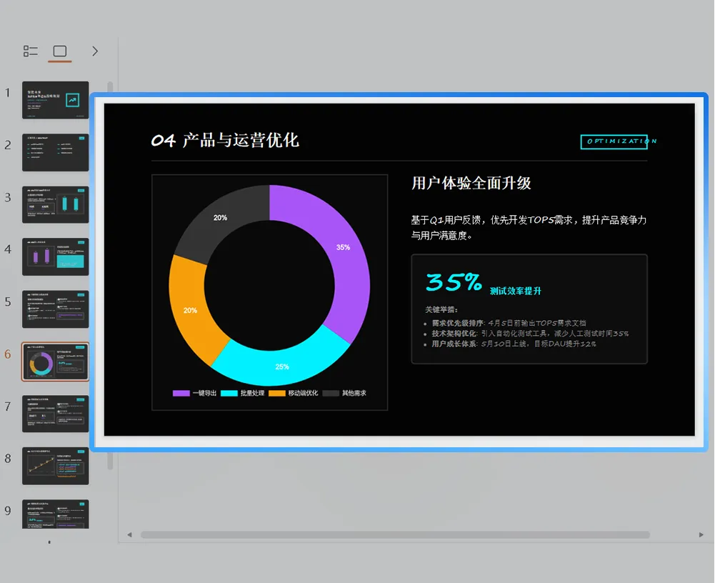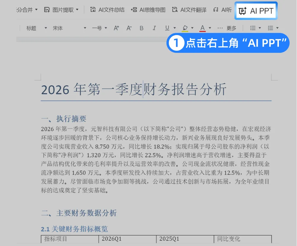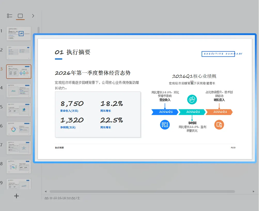 输出的文档用浏览器打开,在查看器中点击「AI PPT」,即可跳转至生成页面,写好的分析迅速转化ppt,AI自动提炼每部分结论,数据自动生成图表,关键数据highlight,文档丝滑转成PTT。