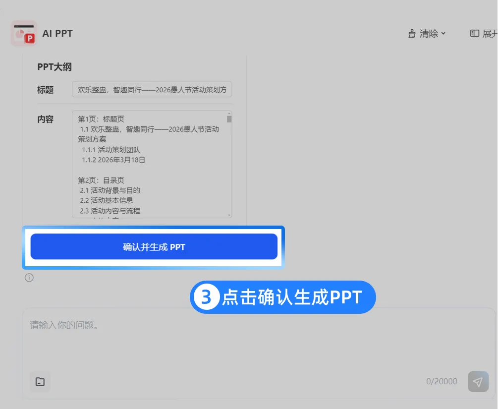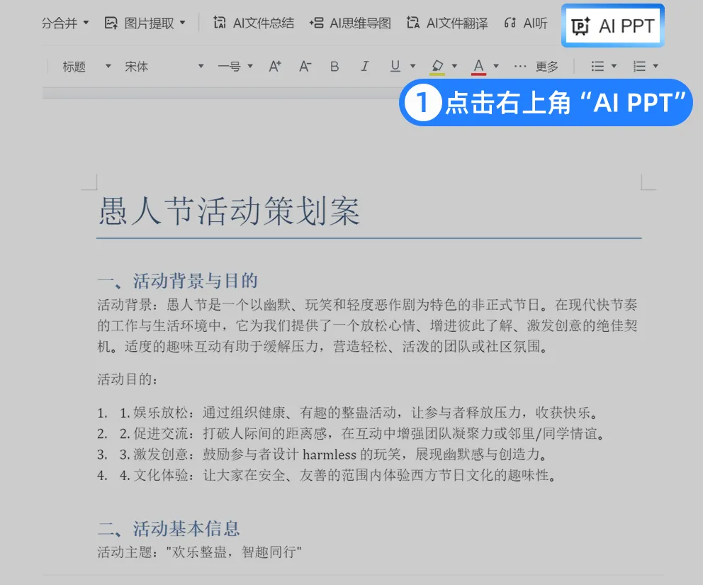 打开文档,在word查看器选择「AI PPT」功能,一键快速转化成PPT!AI自动提取亮点,预算变图表,背景分析、活动亮点、预期效果,一页一页安排得明明白白。