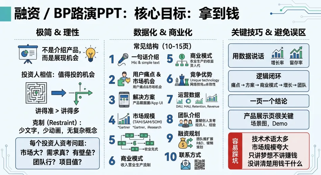 克制!不要大段文字,不要花哨动画,不要讲复杂概念。投资人最关心的是: