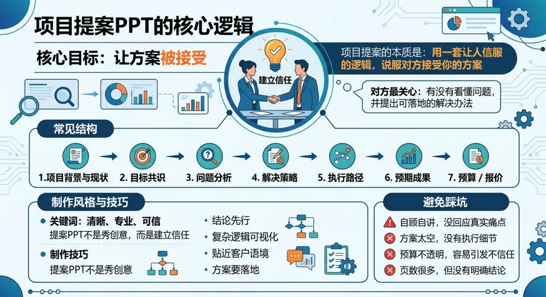 项目提案的本质是:用一套让人信服的逻辑,说服对方接受你的方案。不管面对客户还是领导,他们最关心的都是:你懂不懂问题,能不能落地?