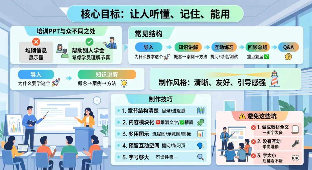 培训PPT和其他类型最大的区别:它不是为了“展示你很懂”,而是为了“帮助别人学会”。所以不能只是信息堆砌,要考虑学员的理解节奏。