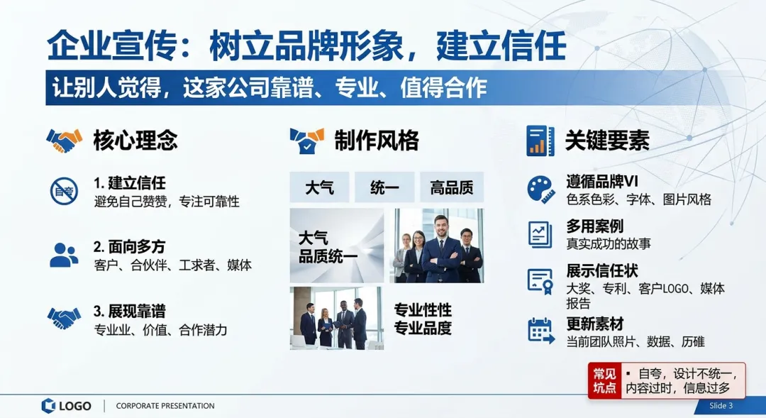 企业宣传类PPT,很多公司都会做成“我们很厉害”的自嗨介绍。但真正有效的企业宣传,是让别人快速建立信任。面对客户、合作伙伴、求职者、媒体,重点是:看完觉得这家公司靠谱、专业、值得合作。
