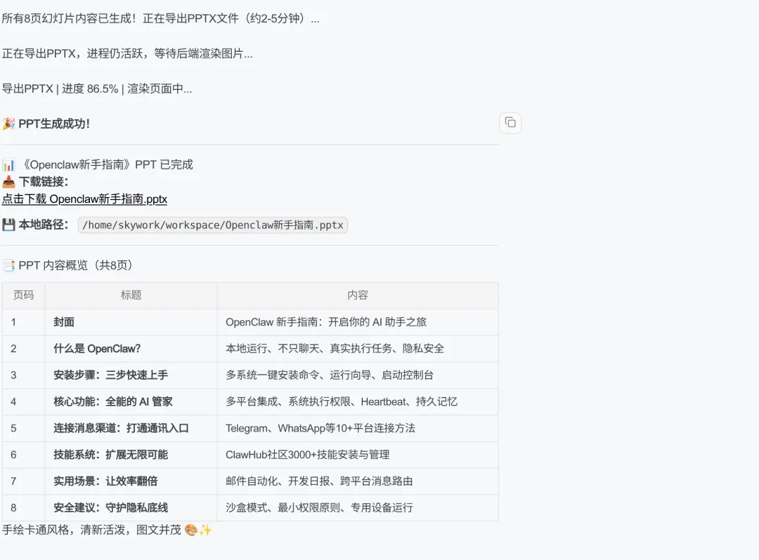 更香的是“自动化周报”:路径配置一次,龙虾每周一早上准时把PPT放你桌面,数字都不用改,直接转发群里——摸鱼神器+1。