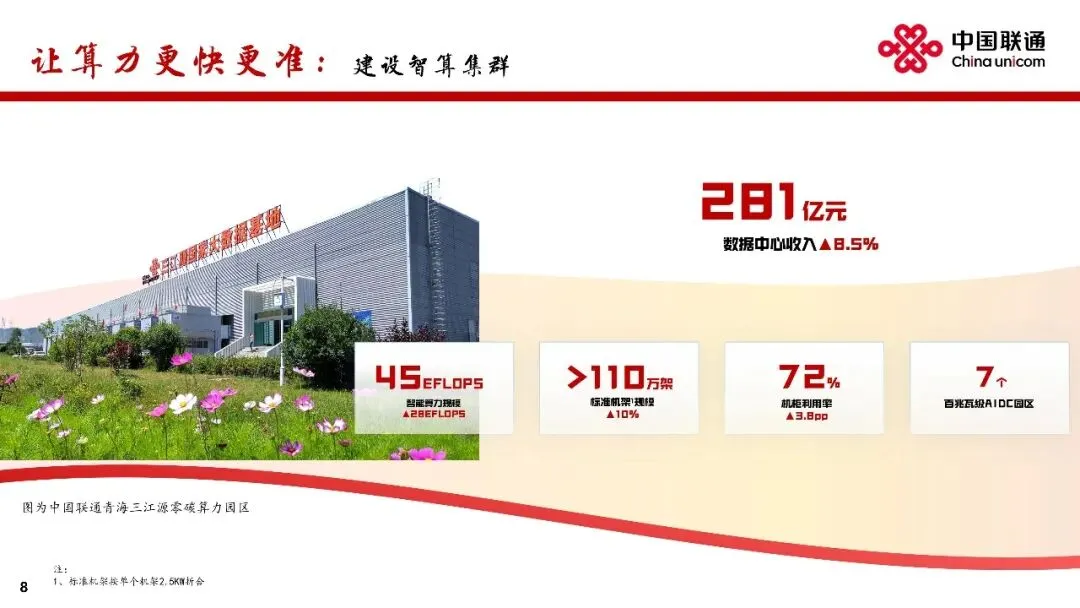 建设智算集群。数据中心收入281亿元,同比增长8.5%。加强“东数西算”枢纽节点和绿色算电示范省的资源佈局,标准机架规模超过110万架,建成7个百兆瓦级AIDC园区,机柜利用率超72%,智算规模达到45 EFLOPS。加快新“八纵八横”骨干光缆网建设,新增超过9000公里,实现算力枢纽节点互联互通,服务区域协调发展。