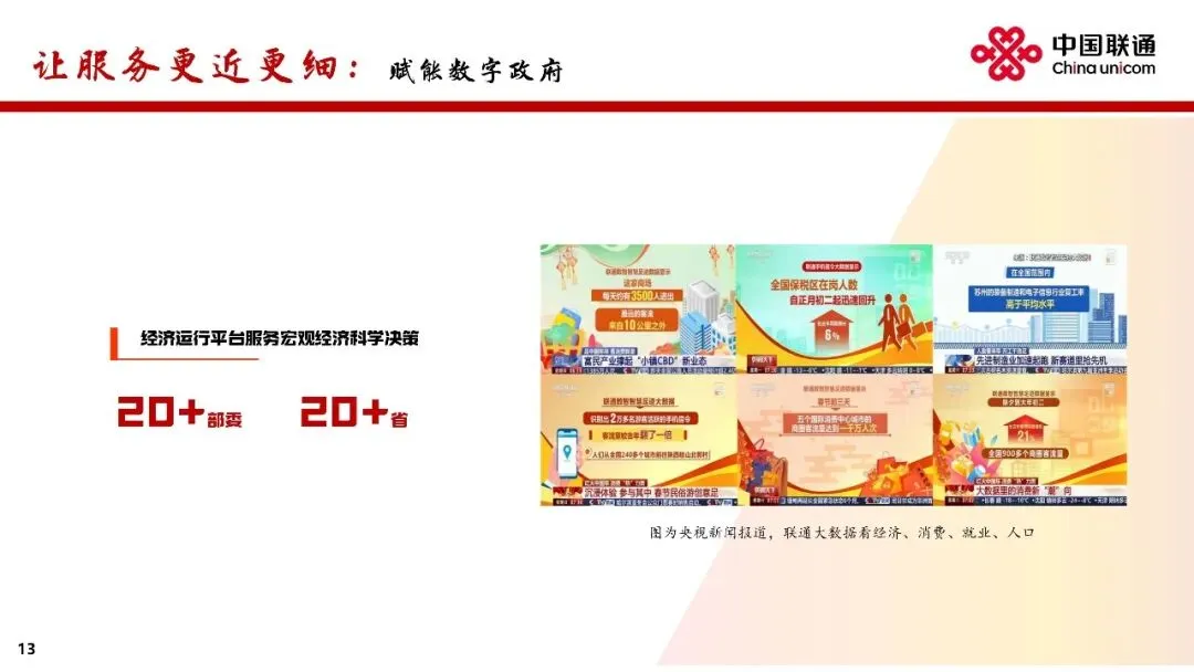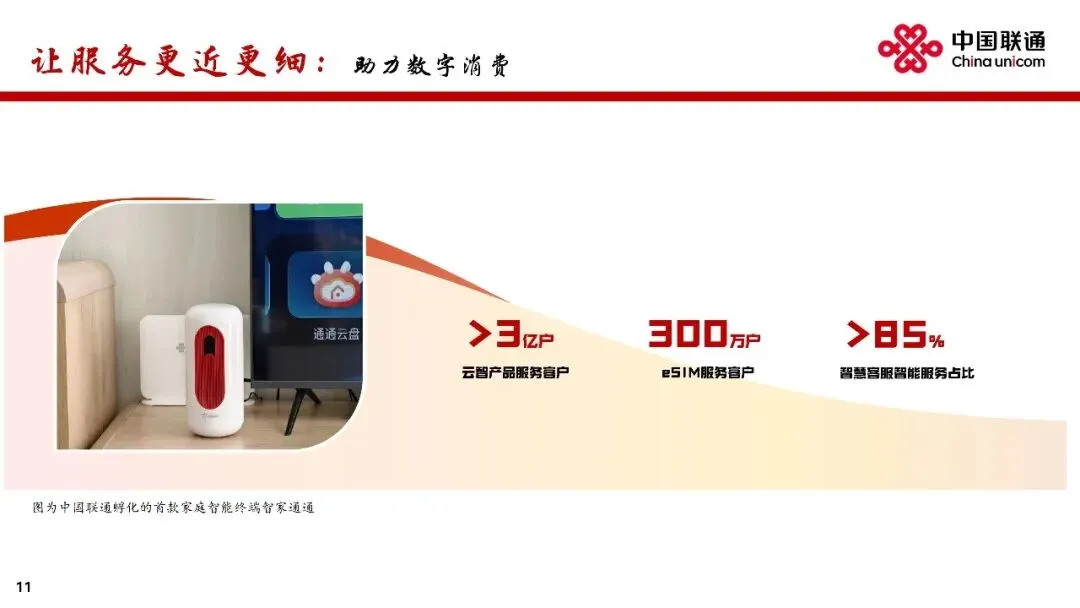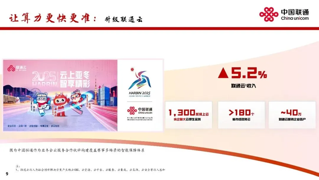 升级联通云。加快向AI云演进,深化超大规模智能云原生实践,提升统一编排调度能力,构建“应用+模型+资源”的算力经营新模式,支撑180多个省市级政务云建设,赋能近40万企业客户数智转型,树立“AI智选联通云”品牌形象,联通云收入同比增长5.2%。