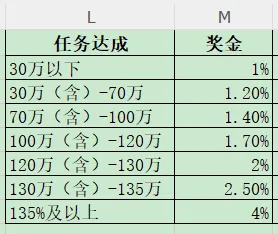 5.第5个参数为匹配模式,任务达成不是N列里的值时,它需要在这个区间选择跟随哪个,比如张三25万,匹配后在0(N2)和30(N3)之间。这时我们要看下L列的意思,25万自然应该按1%(M2)。这样我们就将这个参数值写成-1,意思就是如果是N列区间的数,按较小的值来算。