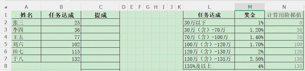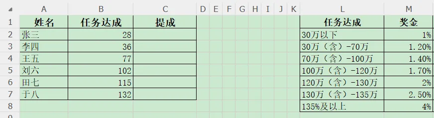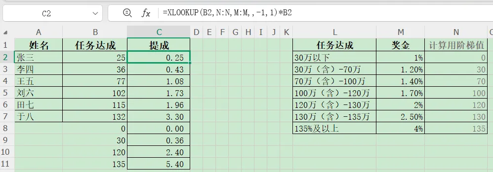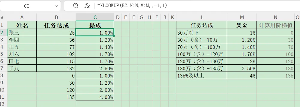 模拟几个业务经理的任务,现在写公式算下提成。当然是使用xlookup函数,我们边分析边写公式: