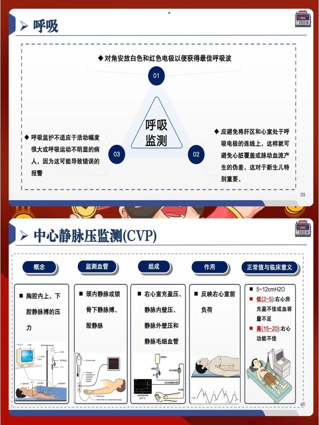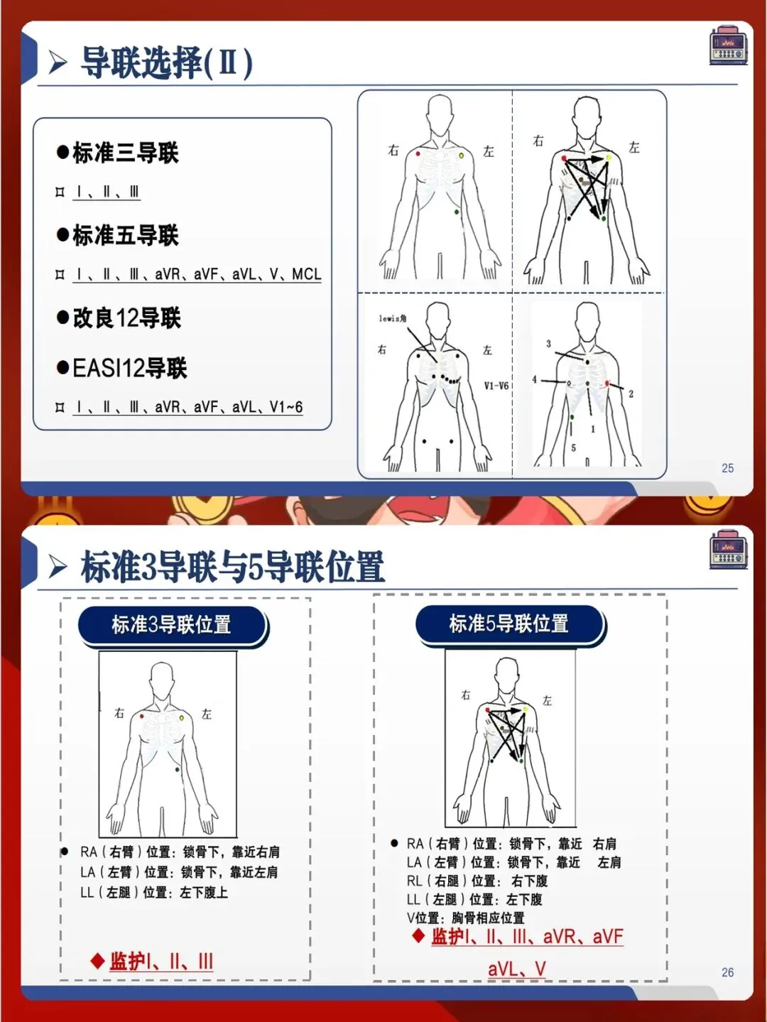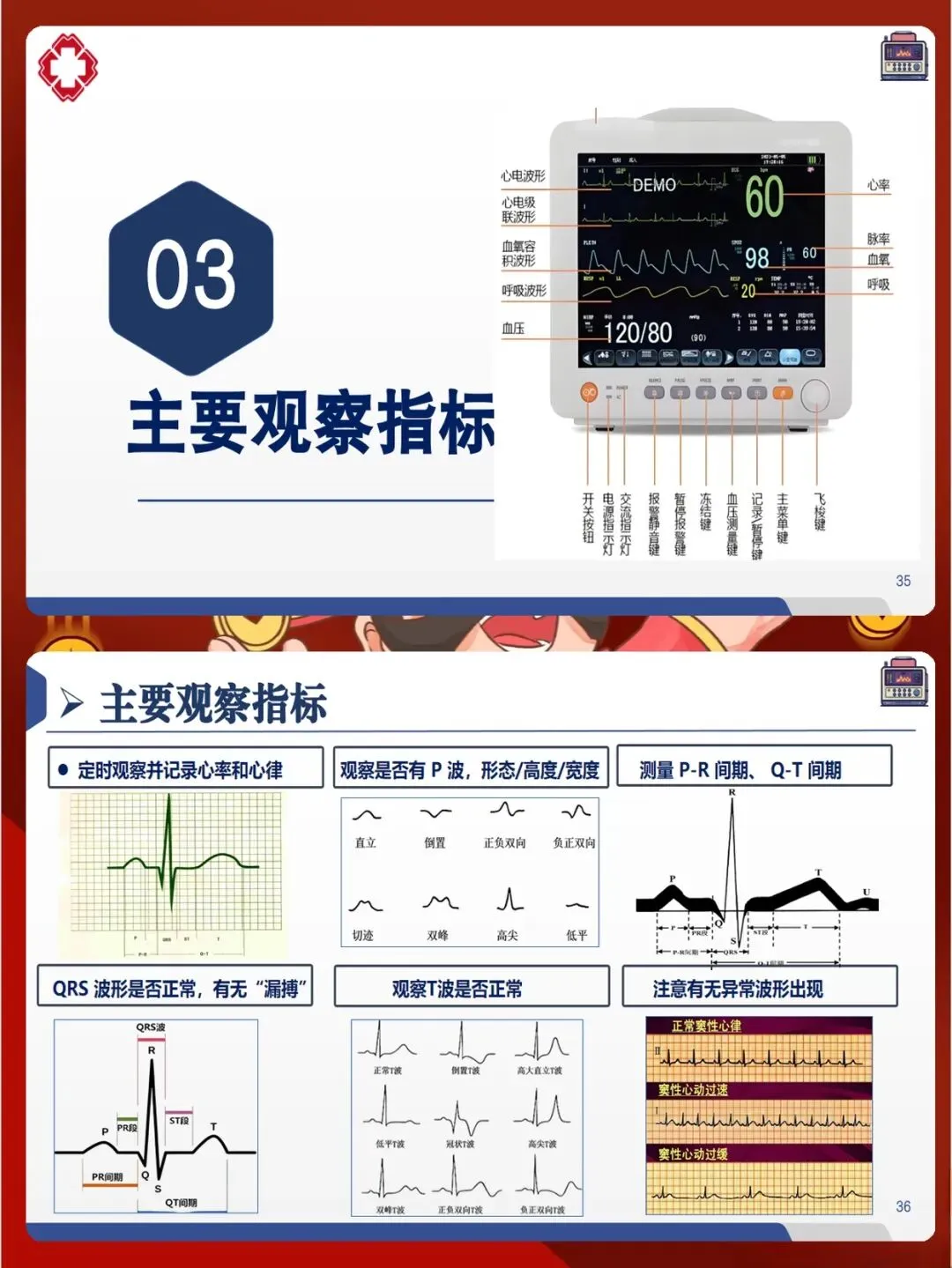 心电监测:通过体表电极记录心脏电活动,是识别心律失常、心肌缺血、电解质紊乱的基础。导联选择应根据监测目的而定,常规监护多采用Ⅱ导联(P波清晰、QRS波群明显),需排查心肌缺血时可加用V1、V5导联。波形应稳定、基线平稳,避免干扰。ST段抬高或压低≥0.1mV需警惕急性冠脉综合征。