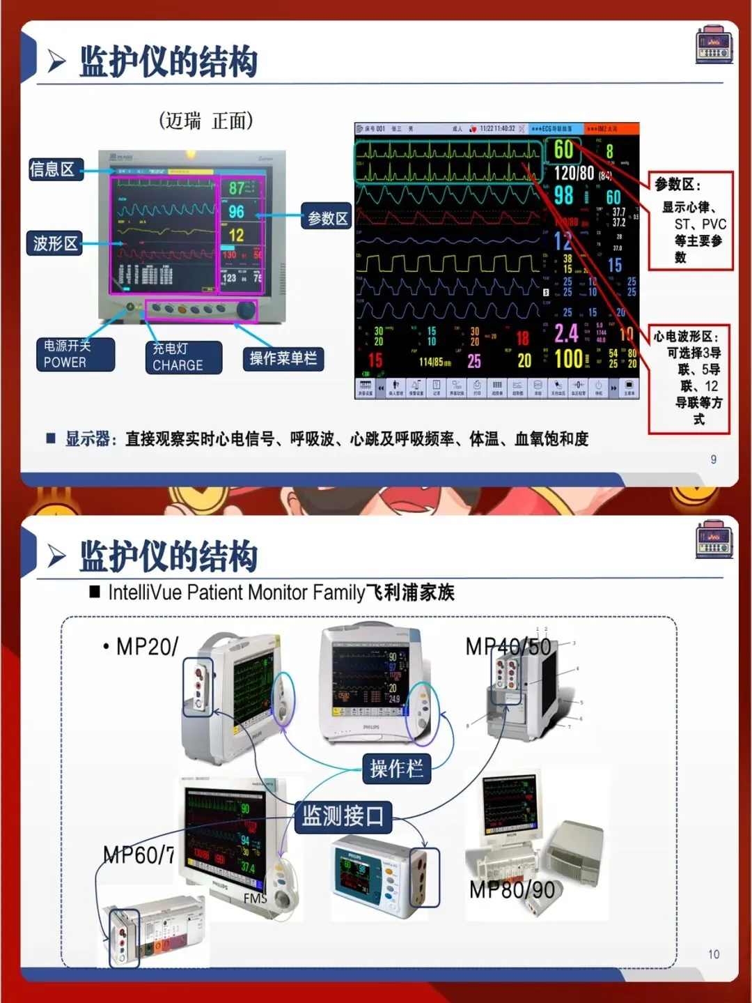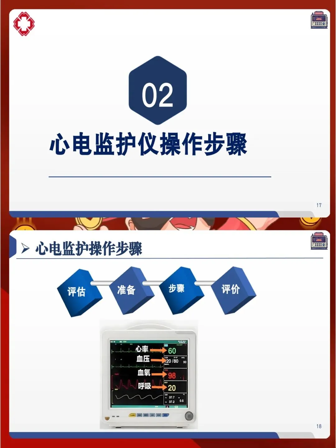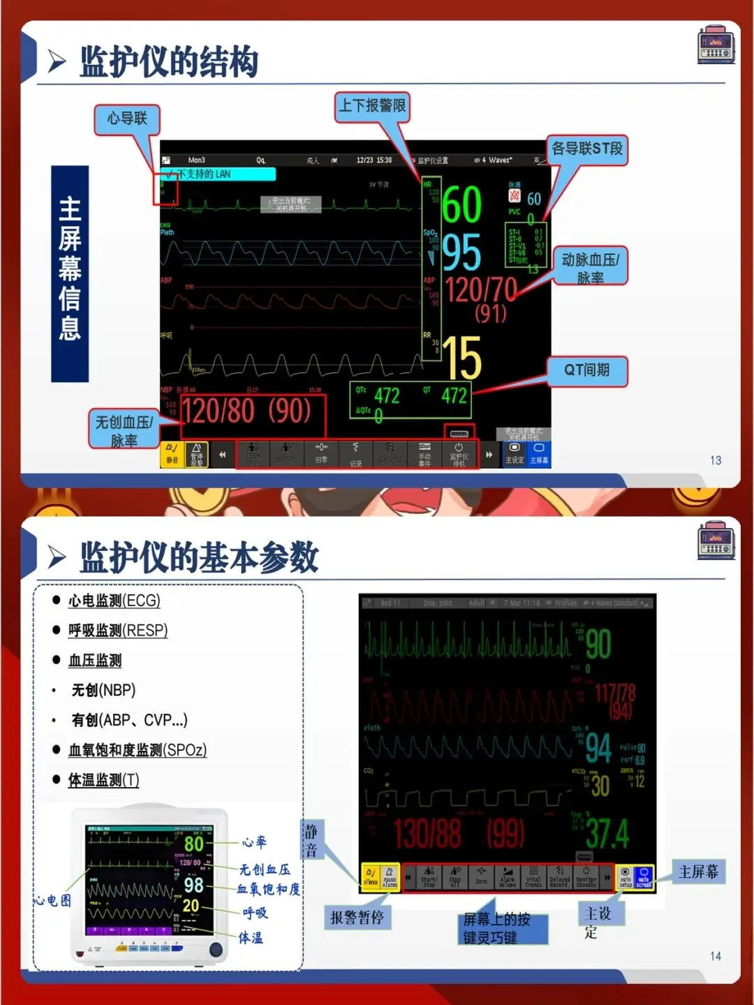 心电监测:通过体表电极记录心脏电活动,是识别心律失常、心肌缺血、电解质紊乱的基础。导联选择应根据监测目的而定,常规监护多采用Ⅱ导联(P波清晰、QRS波群明显),需排查心肌缺血时可加用V1、V5导联。波形应稳定、基线平稳,避免干扰。ST段抬高或压低≥0.1mV需警惕急性冠脉综合征。