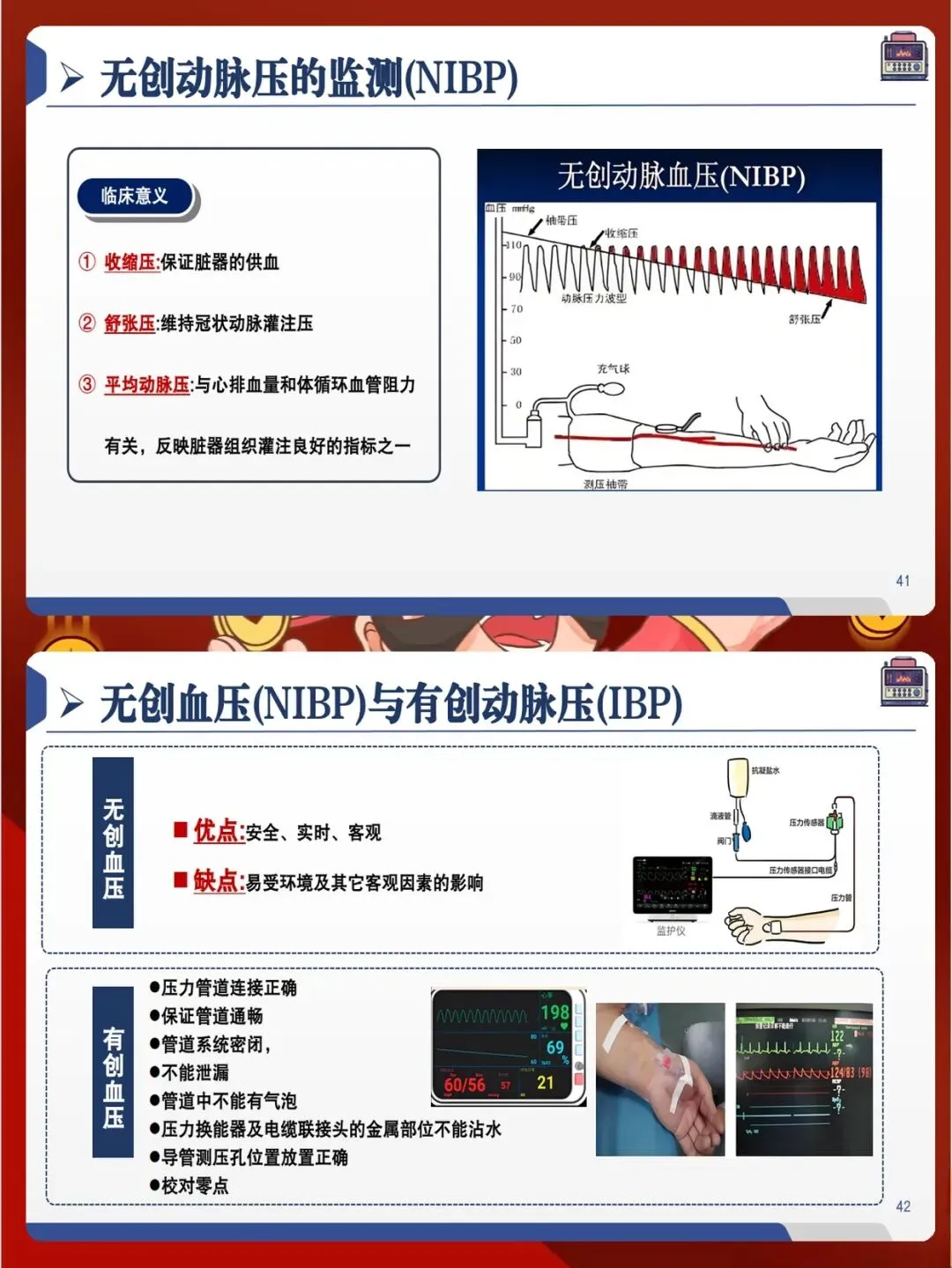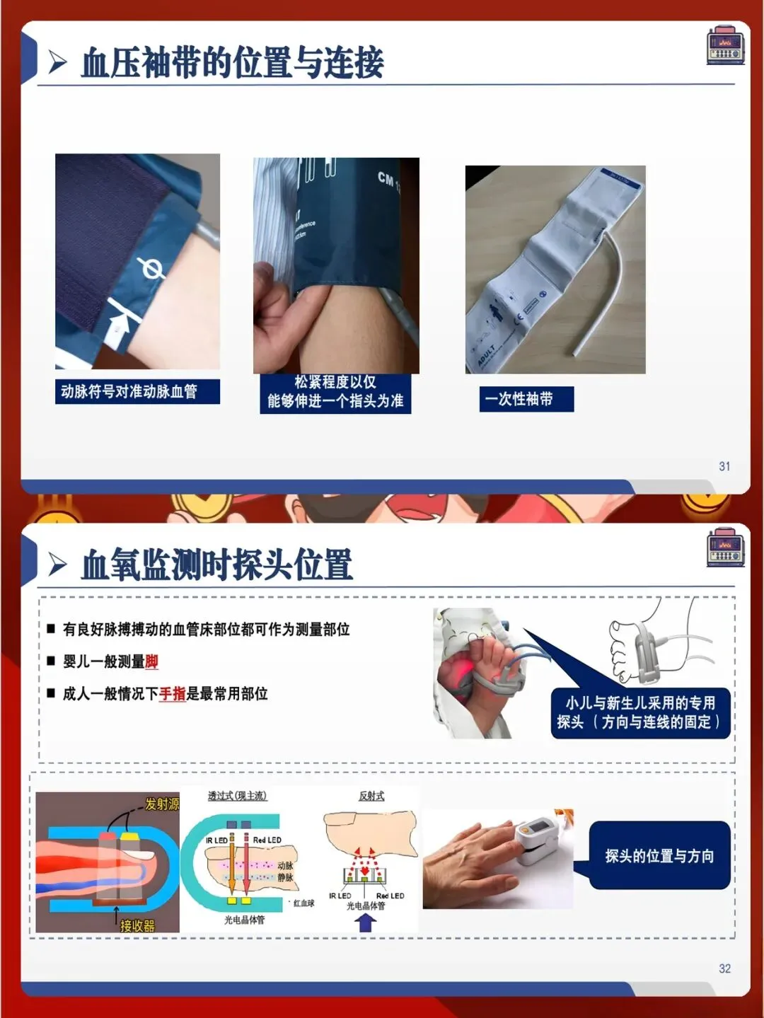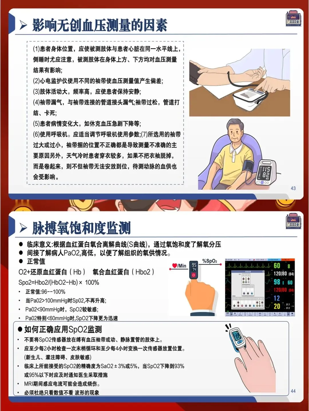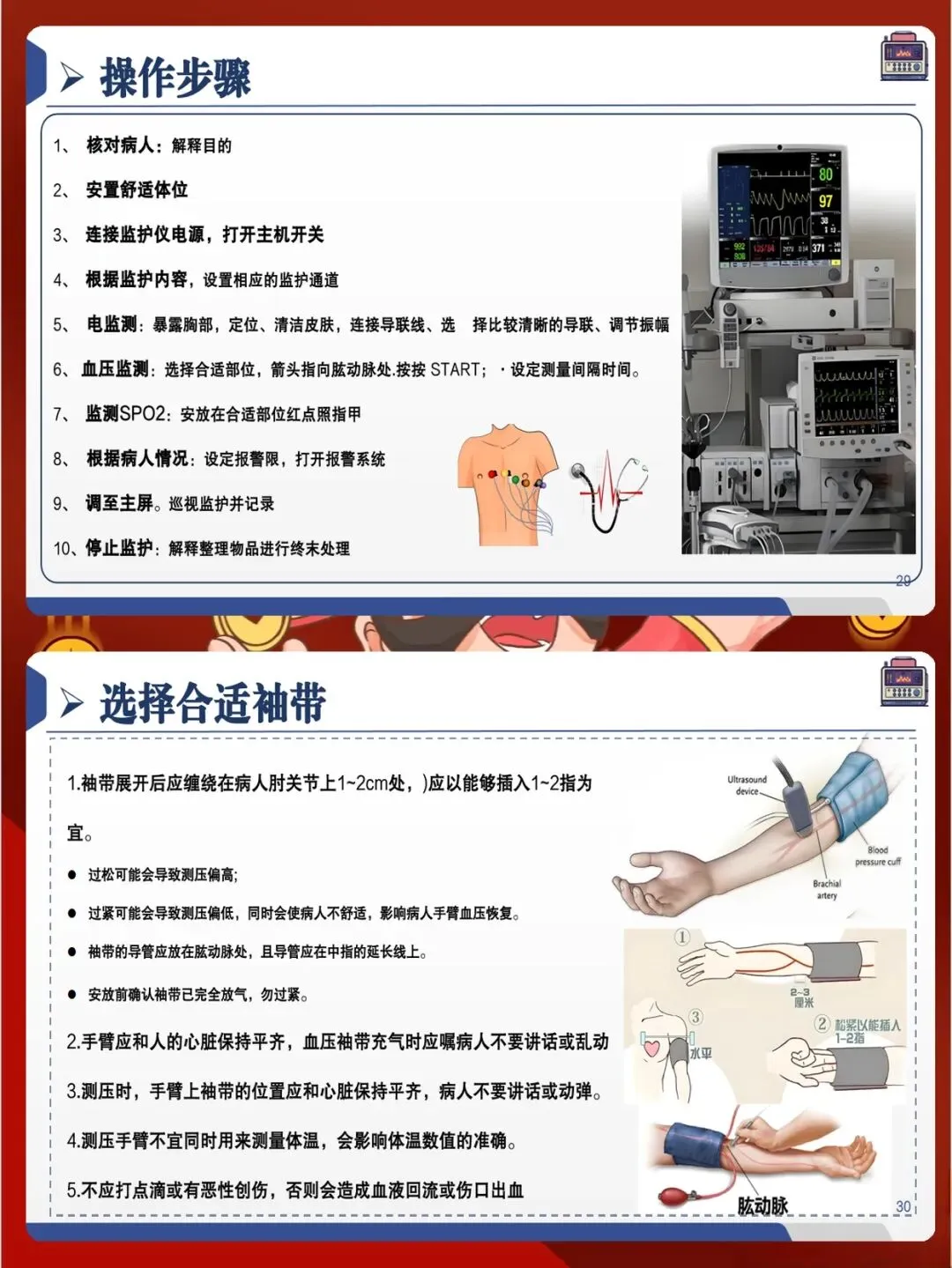 无创血压:采用示波法或振荡法测量,设置间隔时间根据病情调整(危重患者每15-30分钟,稳定患者每2-4小时)。袖带位置应与心脏水平,松紧以能插入一指为宜。连续测量同一侧可能导致肢体水肿,建议双侧交替使用。