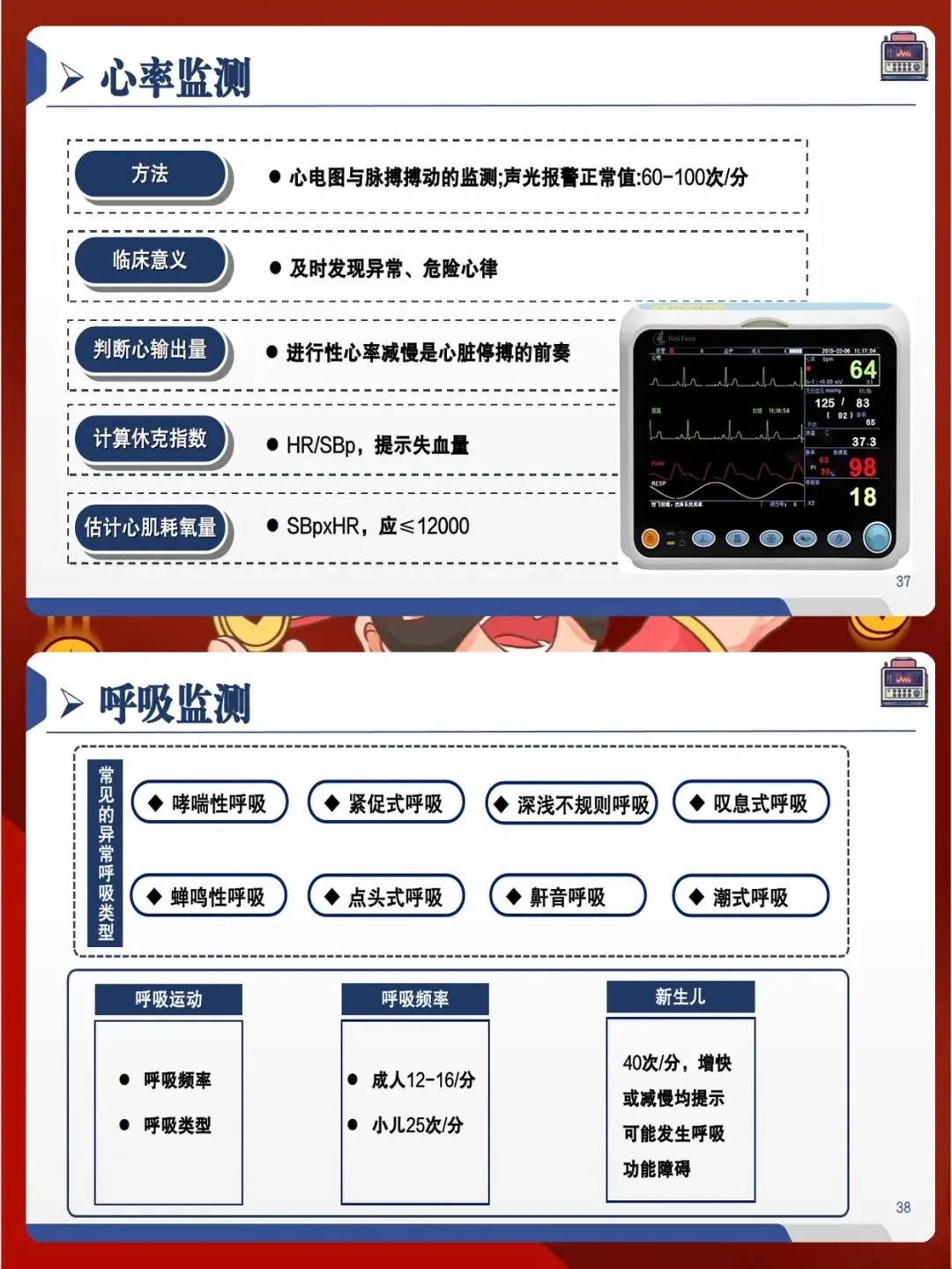 呼吸监测:通过阻抗法或胸带法监测呼吸频率,正常值12-20次/分。呼吸暂停≥20秒需警惕睡眠呼吸暂停或中枢性呼吸抑制。