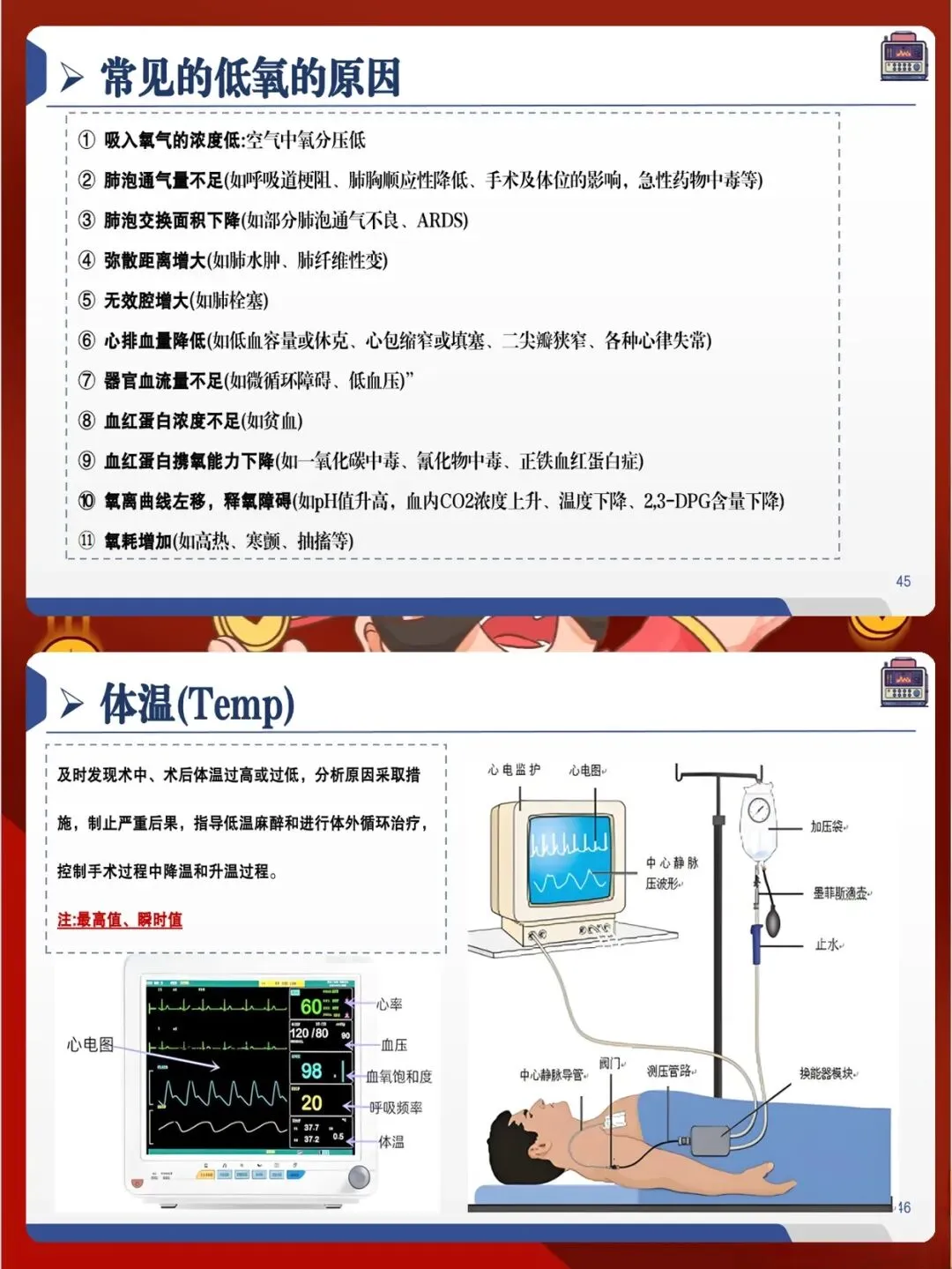 体温监测:核心温度监测可选腋下、口腔、直肠或鼓膜,腋温正常值36.0-37.0℃。发热提示感染,低温则可能提示休克或体温调节障碍。