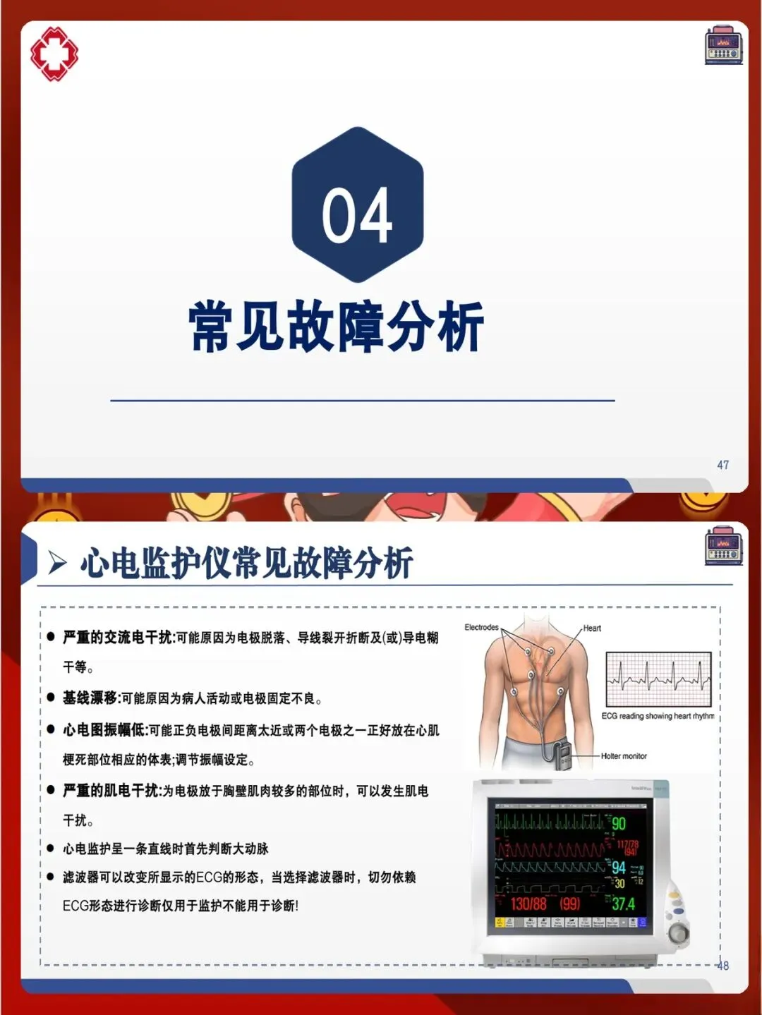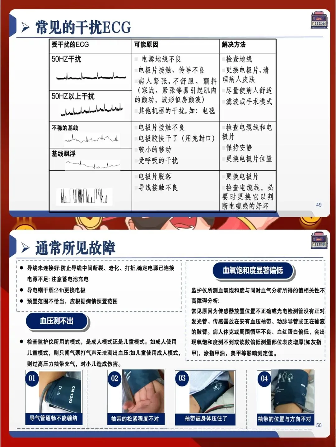 波形干扰:常见原因包括电极松动、导联线断裂、患者躁动、电磁干扰(如手机、电刀)。解决方法:重新粘贴电极、更换导联线、安抚患者、远离干扰源。基线漂移多因呼吸运动幅度大,可嘱患者平稳呼吸。