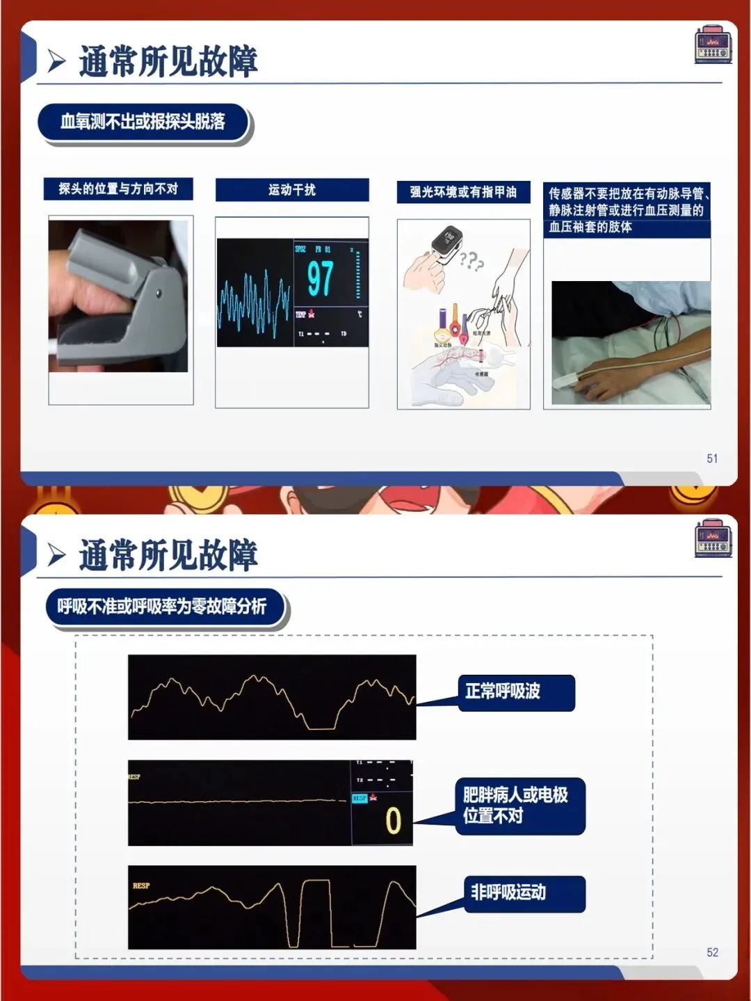 血压测量失败:袖带漏气、袖带位置不当、肢体活动、管路扭曲。解决方法:更换袖带、调整位置至肱动脉处、嘱患者放松、理顺管路。