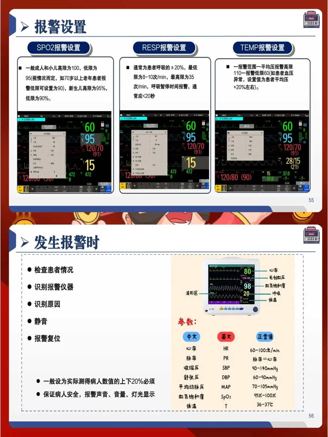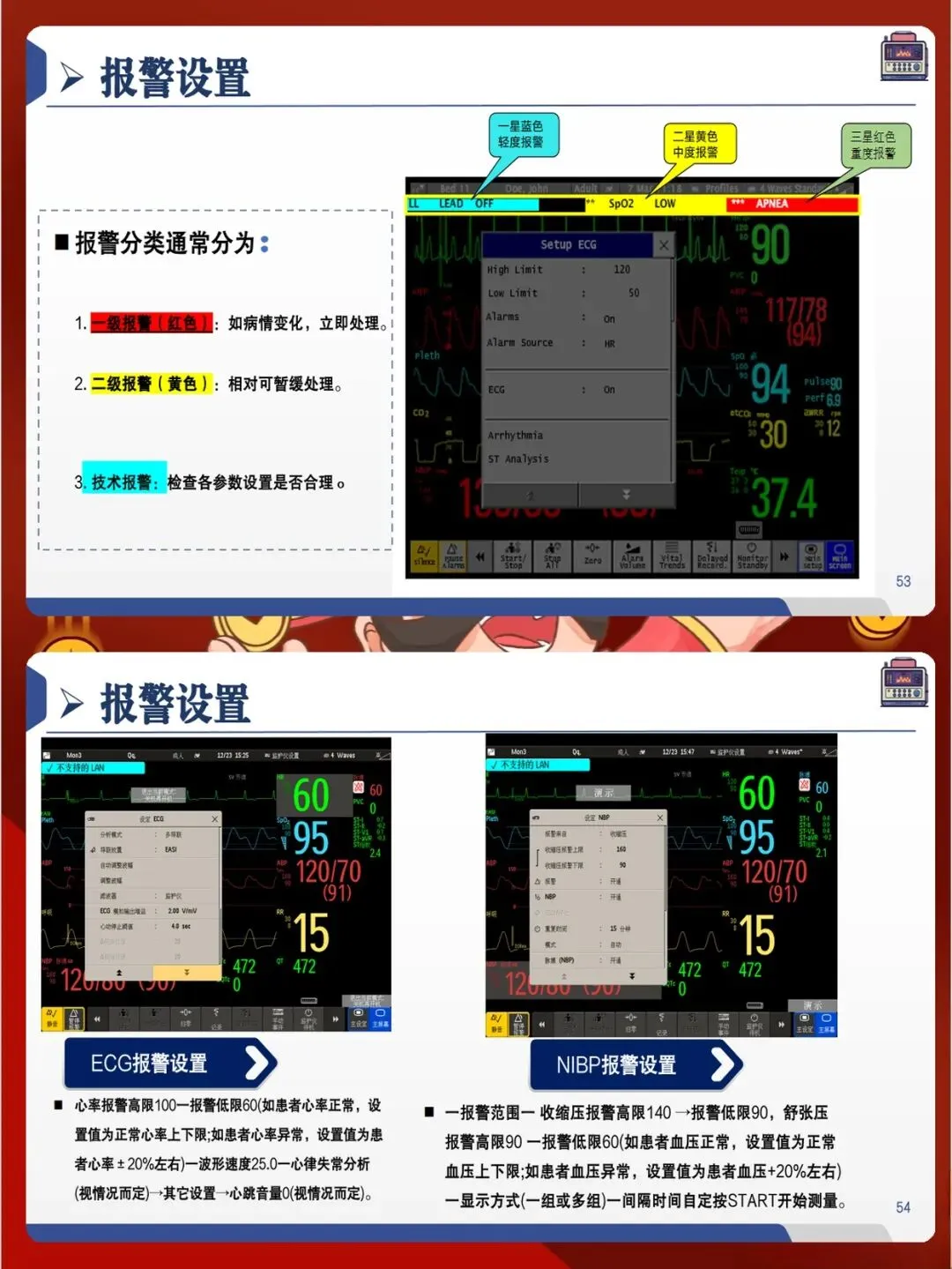 报警疲劳是临床常见问题。需定期评估报警设置合理性,避免假报警过多。对于频繁假报警(如房颤患者心率波动),可适当放宽报警上限或设置延迟报警,但必须在医嘱下进行并做好记录。