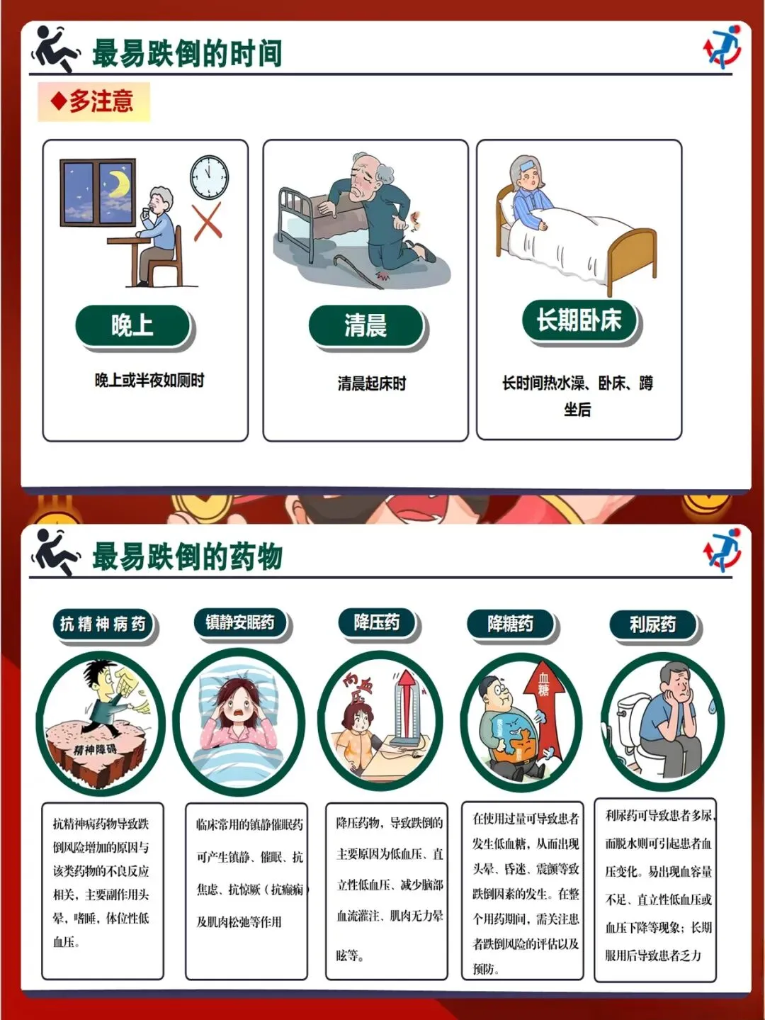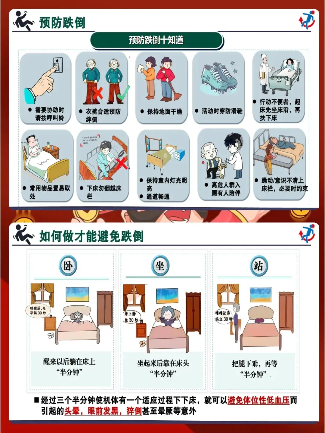 活动指导:起床、站立、行走时动作缓慢,避免突然转身、快速起立。行走时集中注意力,避免边走边看手机、聊天。夜间如厕时先坐起片刻,再下床,必要时开灯或呼叫协助。