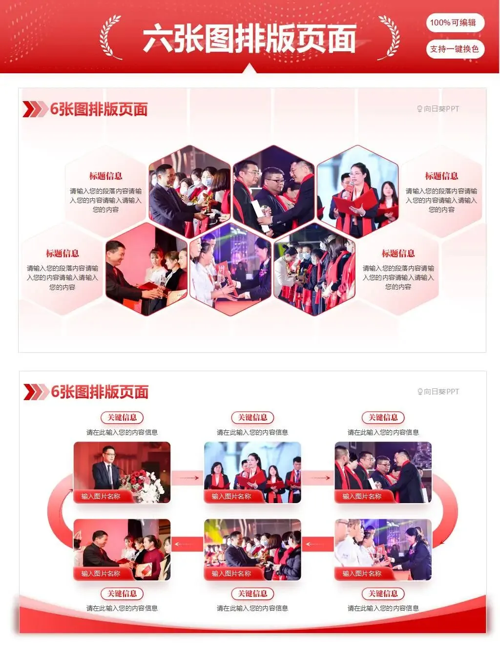 六图规整矩阵排布,2×3或3×2等分布局,版面整齐有序,信息承载量适中,适用于产品图集、服务流程、多维度卖点、成果展示,图文排版紧凑不杂乱,整体呈现专业整洁的视觉效果。