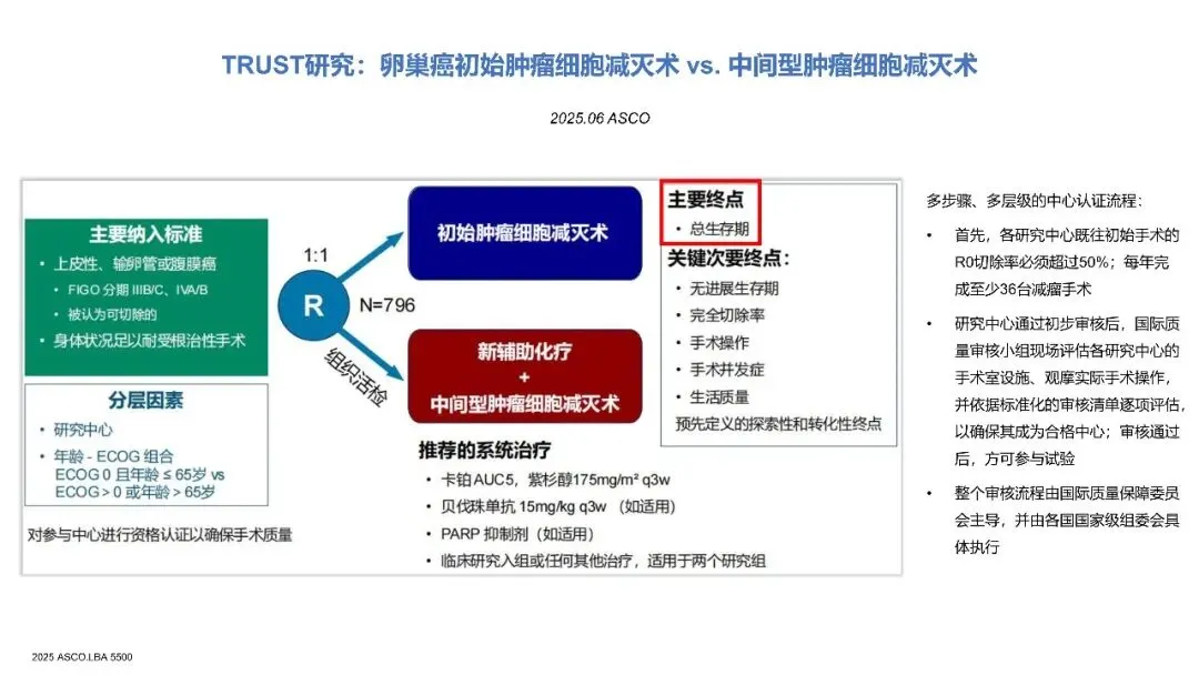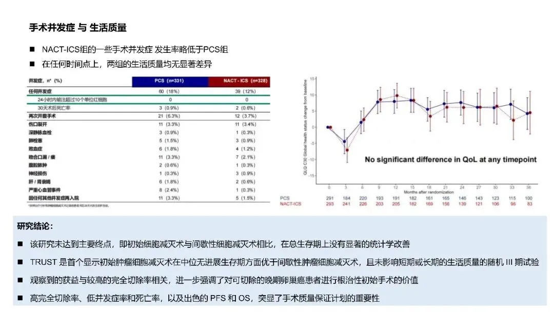 关于卵巢癌选择 初始肿瘤细胞减灭术 还是选择 中间型肿瘤细胞减灭术的学术争论还在继续;回归到TRUST研究中的数据,究竟值不值得以更高的手术创伤换取无统计学意义的OS数值改善,仁者见仁、智者见智
