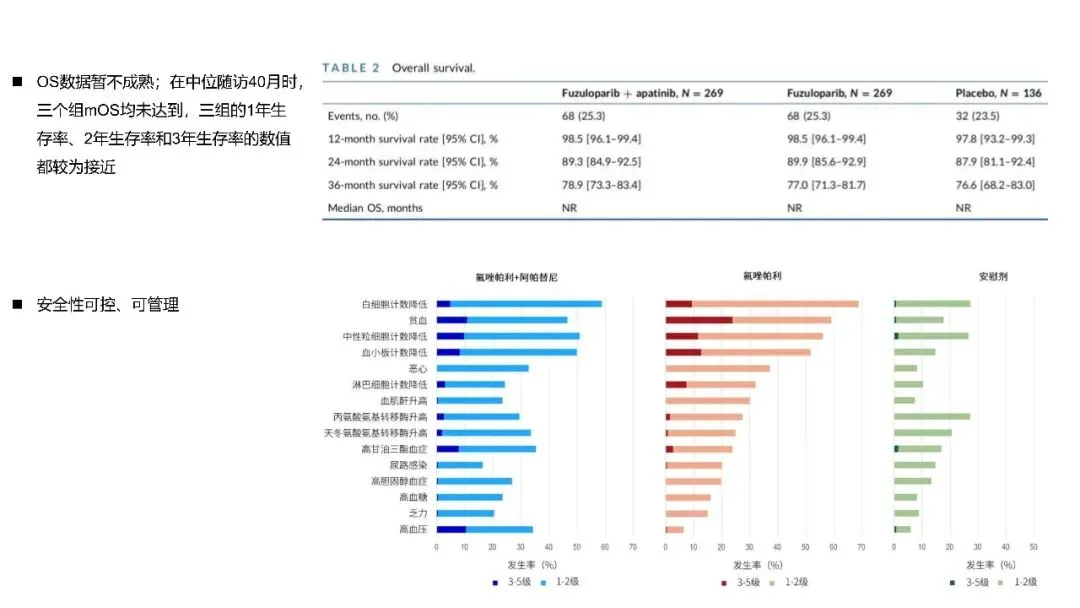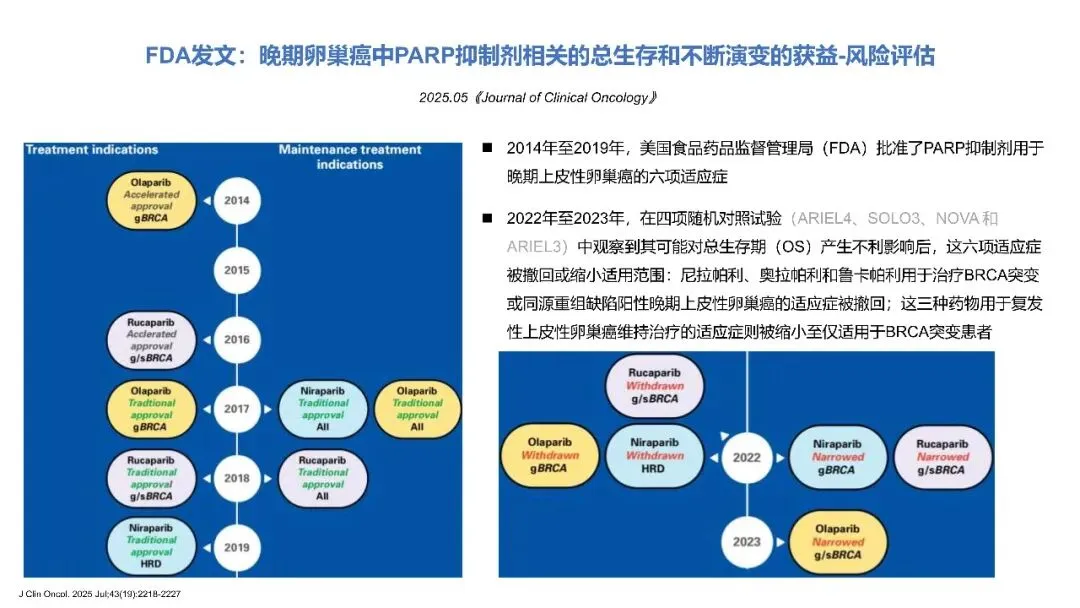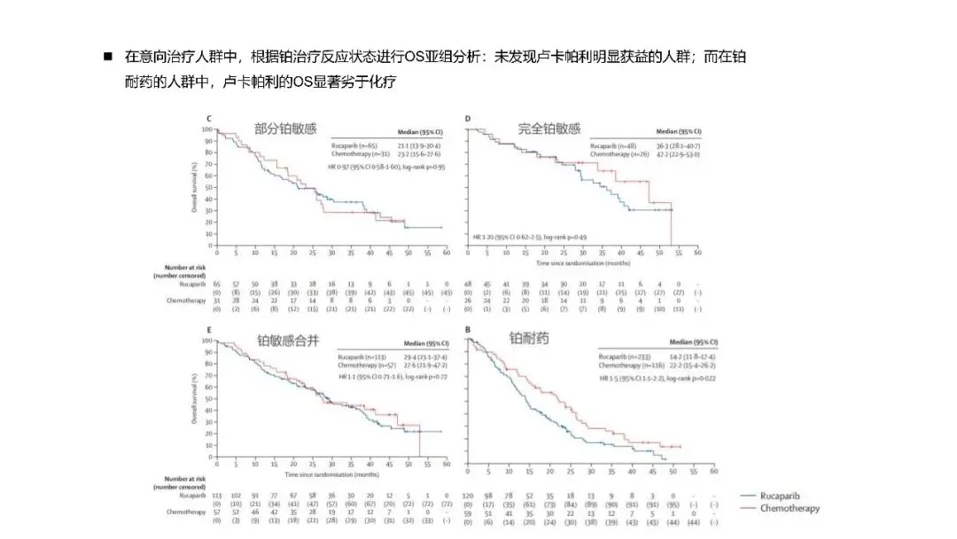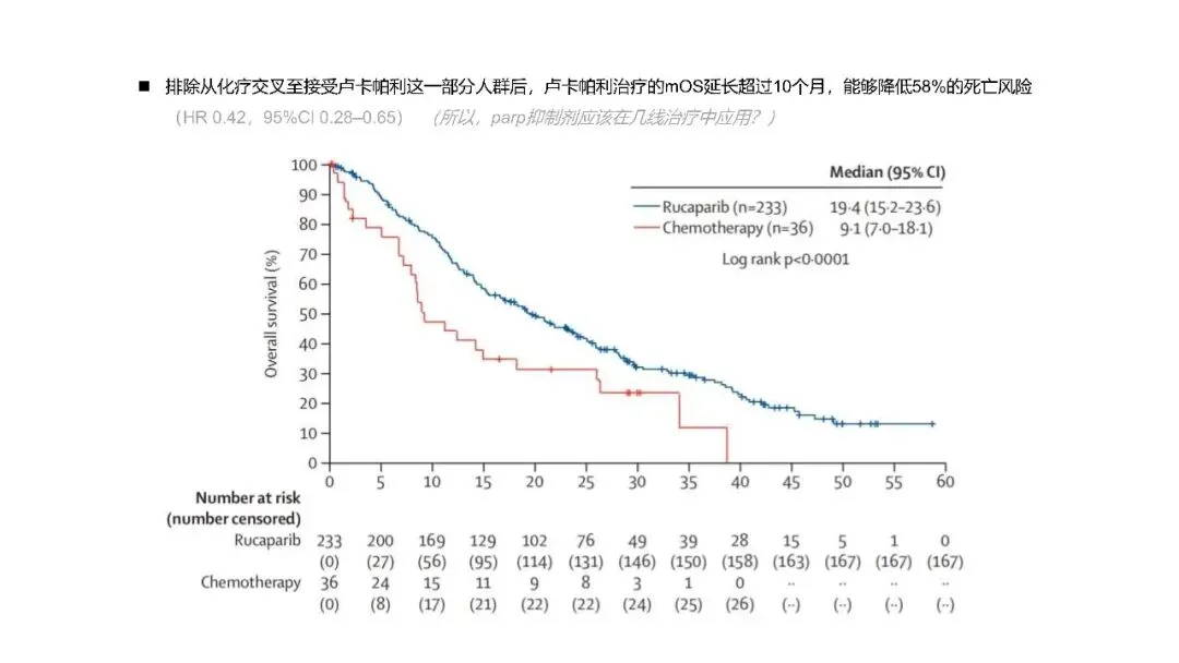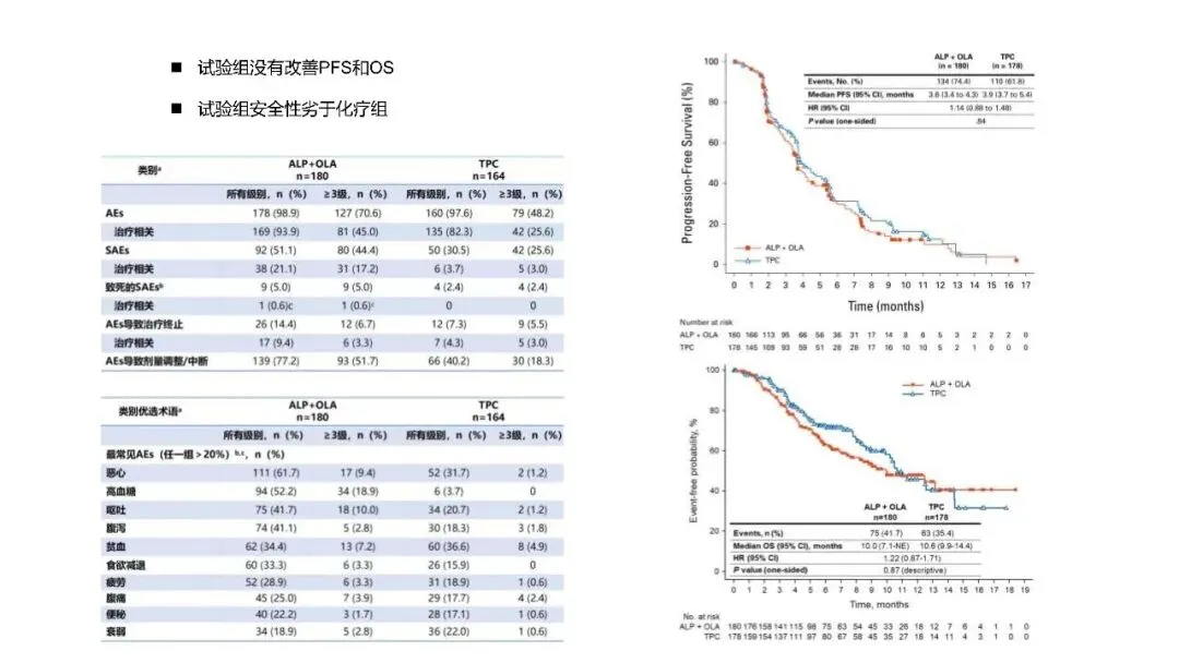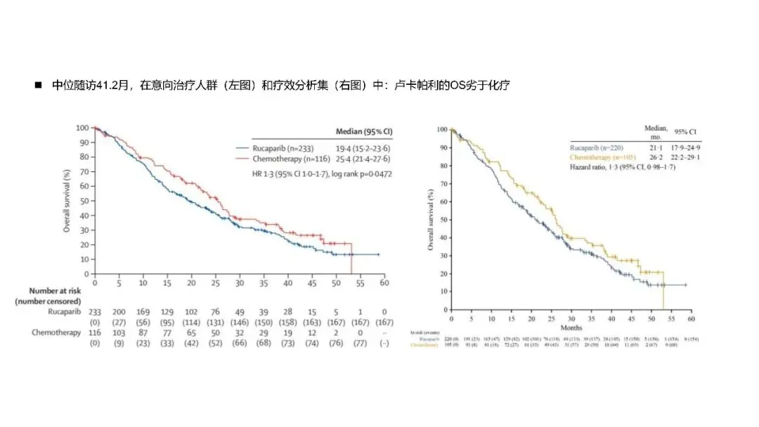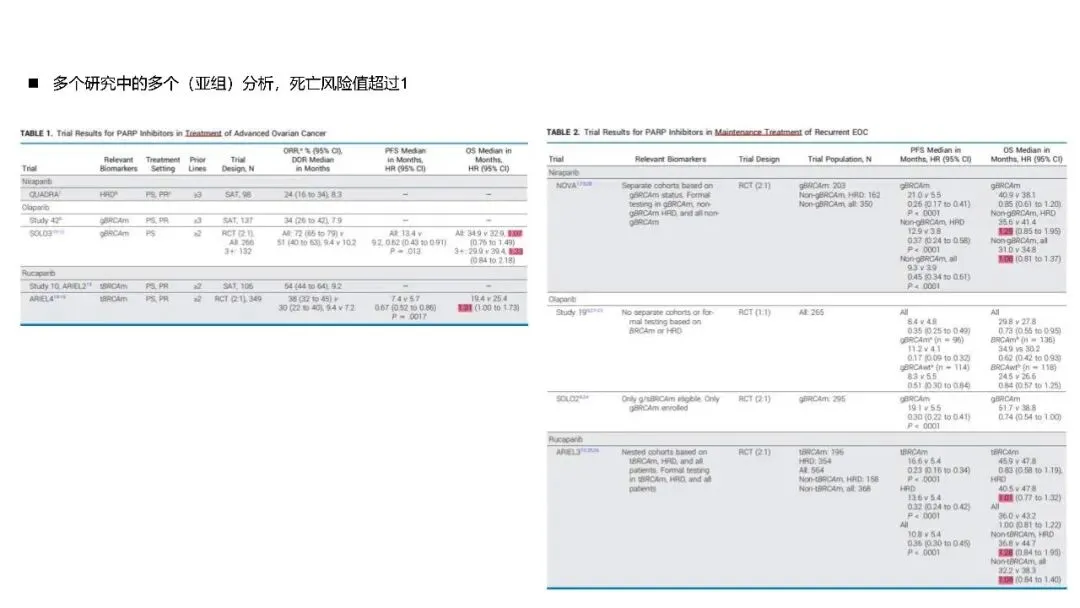 就目前的多项研究来看,PARP抑制剂在卵巢癌中似乎呈现出相似的治疗结局:PFS显著获益而OS获益不明显。借用FDA发表的文章观点:PARP抑制剂治疗的死亡风险比值(HR)>1 是令人担忧的严重安全性信号,它使早期肿瘤控制的获益是否超过患者在后续抗癌治疗过程中所承担的风险变得不确定