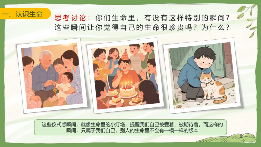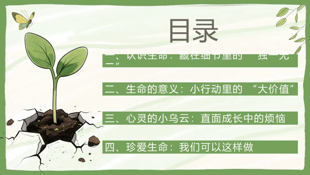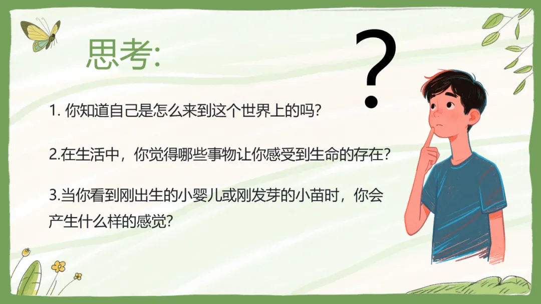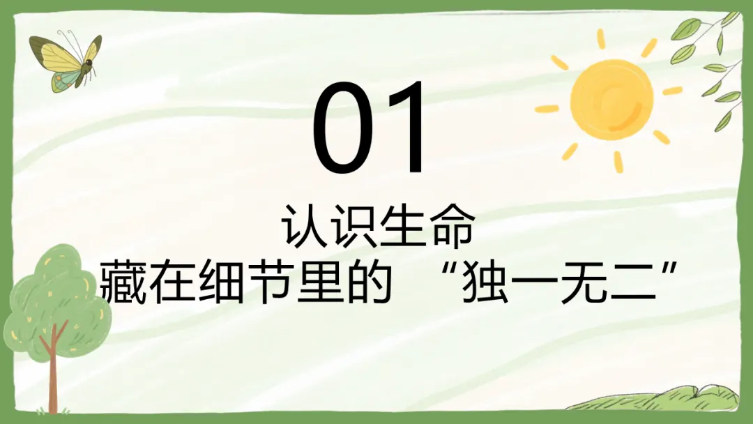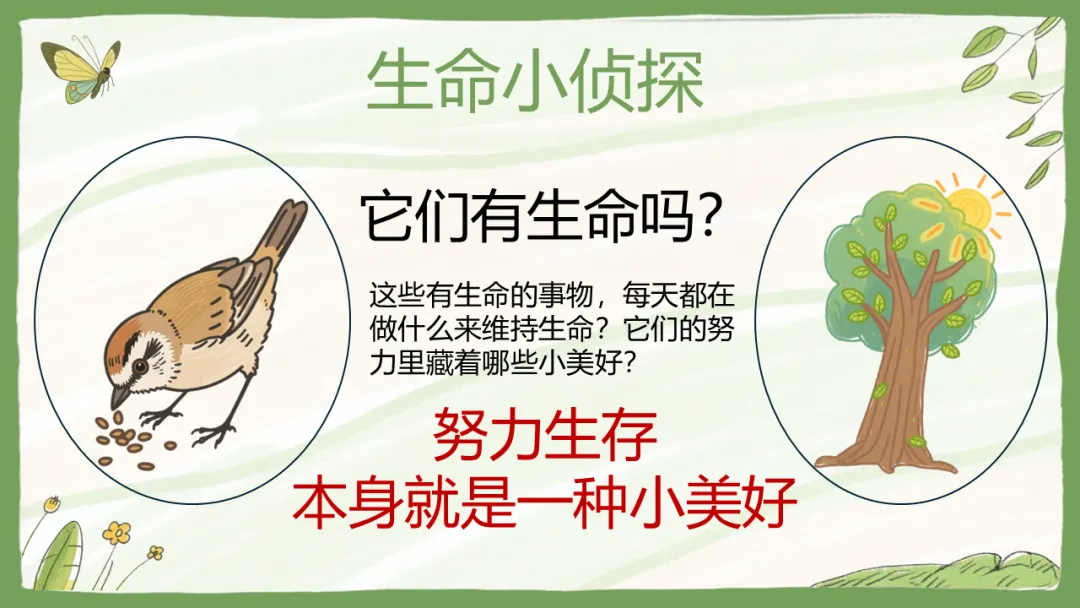 我们先来做个小侦探的游戏:大家看看窗外那棵树,或者桌上的绿植,它们有生命吗?有。那小蚂蚁呢?也有。那我们自己呢?当然有。