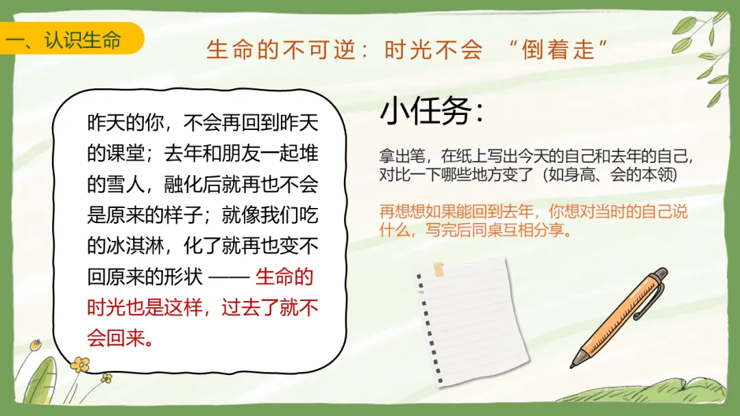 而且,生命还有一个特点:它不会倒着走。去年的你和现在的你,长高了,懂事了,可能也多了一些烦恼。如果能回到去年,你想对那个自己说什么?是“你真棒”,还是“别怕,一切都会过去”?