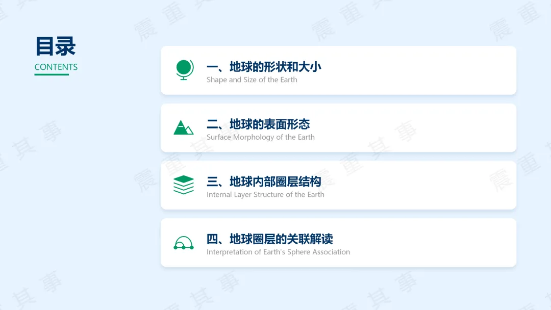 大家现在看到的是今天的内容目录,我们会分四个部分展开讲解:第一部分讲讲地球的形状和大小,看看人类是如何一步步认清地球模样的;第二部分探索地球的表面形态,了解海陆分布和地表的高低起伏;第三部分深入地球内部,认识它的圈层结构;最后第四部分,解读地球各个圈层之间的关联和相互作用。四个部分层层递进,带大家全面认识地球。