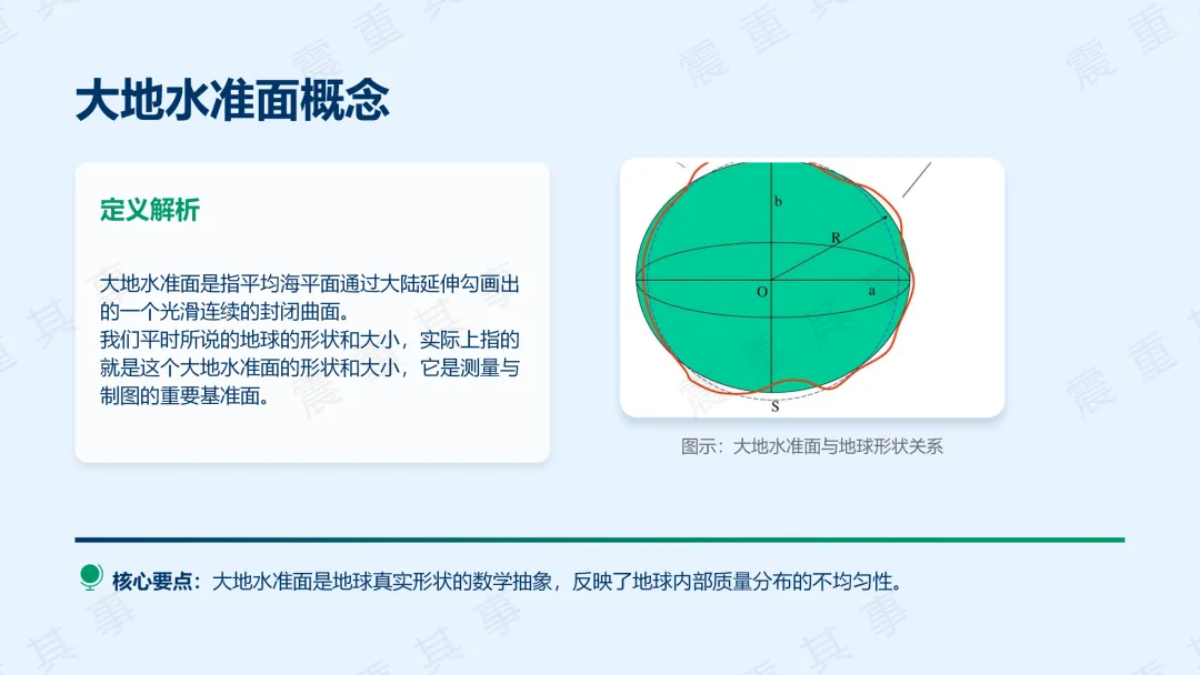 了解了地球形状的认知历程,我们还要知道一个重要的概念——大地水准面。什么是大地水准面呢?简单说,就是把全球的平均海平面,沿着大陆的方向一直延伸,勾画出的一个光滑、连续的封闭曲面。我们平时说地球的形状和大小,其实指的就是这个大地水准面的形状和大小,它是我们进行地理测量、绘制地图的重要基准面,非常关键。