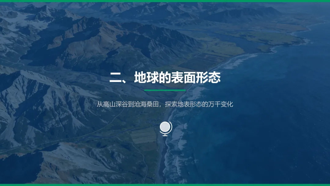 看完了地球的整体形状和大小,接下来我们进入第二部分,地球的表面形态。地球的地表不是一成不变的,从高耸的高山、幽深的峡谷,到曾经的沧海变成如今的桑田,地表形态有着万千变化,接下来我们就从海陆分布、高低起伏等方面,探索地球表面的奥秘。