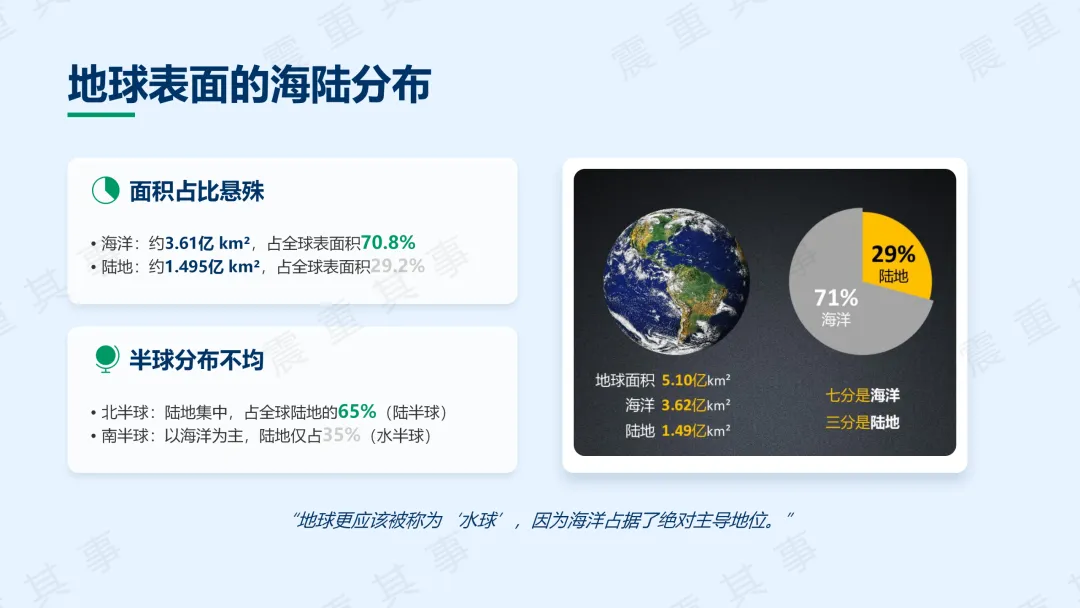 结合海陆的面积占比,我们其实可以说,地球更应该被称为“水球”,因为海洋在地球表面占据了绝对的主导地位,所谓的“七分海洋,三分陆地”,就是对地球海陆分布最形象的概括。
