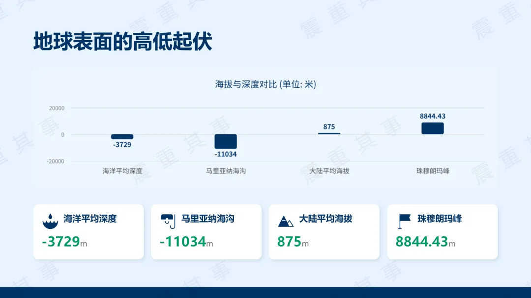 说完了海陆分布,我们再来看看地球表面的高低起伏,地球表面的海拔和海洋深度差异非常大,这张图给我们展示了关键的数值对比,接下来我们一个个看这些重要数据。