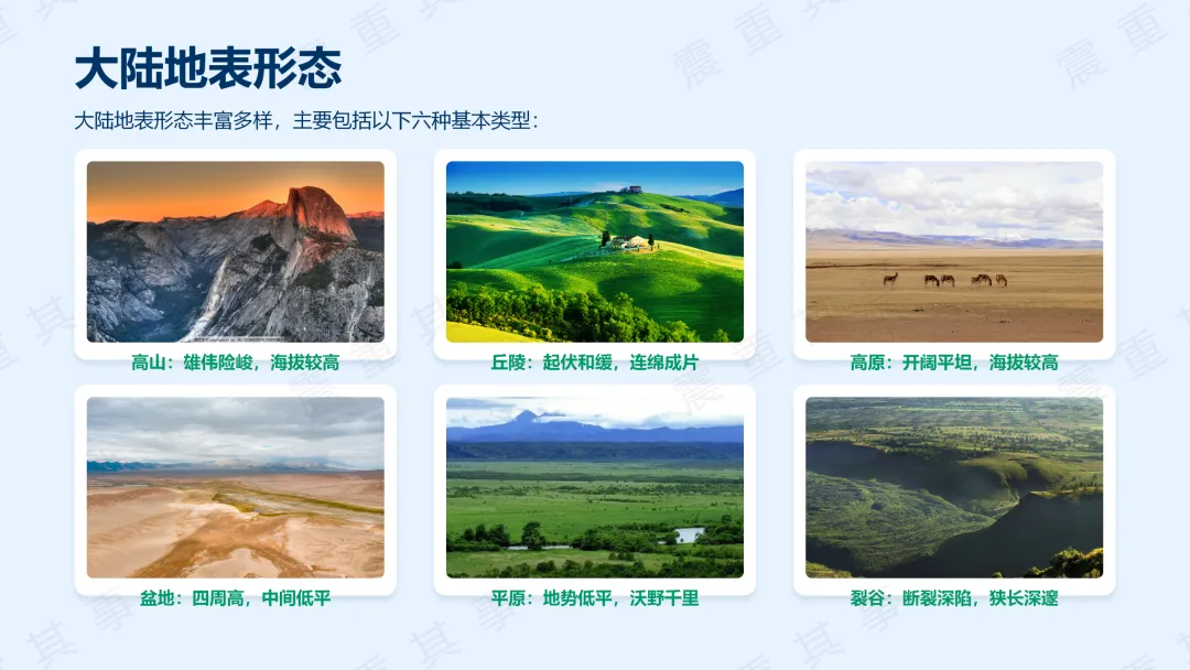 看完了整体的高低起伏,我们来具体看大陆的地表形态,大陆的地表形态丰富多样,主要可以分为六种基本类型,接下来我们分别认识一下。