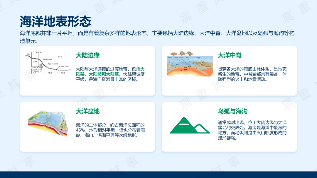 首先是大陆边缘,它是大陆和大洋连接的过渡地带,主要包括大陆架、大陆坡和大陆基三部分。大家看这张图,大陆架的坡度非常平缓,平均深度只有130米,而且是海洋资源最丰富的区域,渔业、石油、天然气资源都集中在这里;大陆坡是从大陆架到大洋盆地的过渡,深度在1400到3200米之间;大陆基则连接着大陆坡和深海床,平均深度3700米。