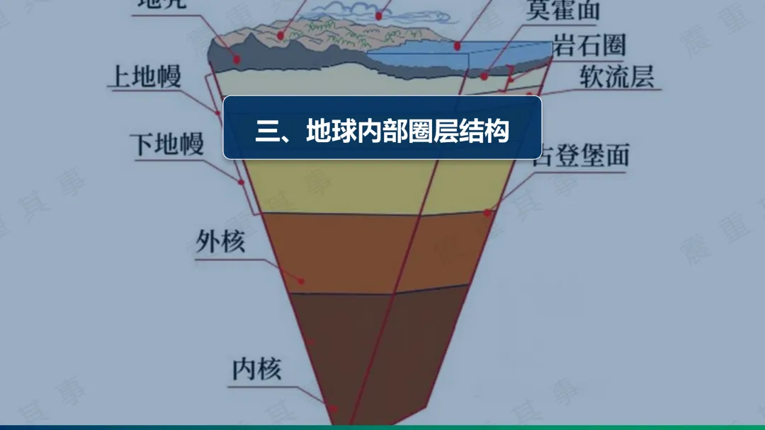 探索完地球的表面,接下来我们一起深入地球内部,看看第三部分的内容——地球内部圈层结构。大家看这张地球圈层结构示意图,地球的内部不是一个实心的整体,而是分成了不同的圈层,还有大气圈、水圈、生物圈这些外部圈层,而我们今天重点讲的是内部圈层,它的划分主要依靠地震波这个探测工具,接下来我们详细说。