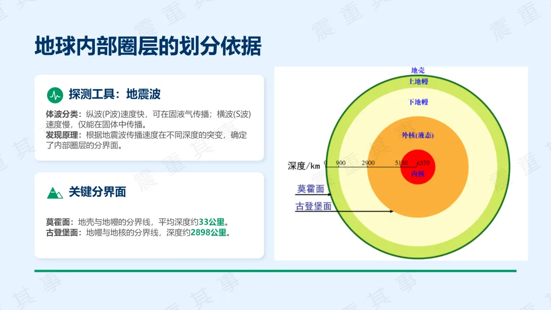 地球内部圈层的划分,核心依据就是地震波。地震波是地震发生时产生的波动,主要分为体波中的纵波和横波,纵波也叫P波,它的传播速度快,而且可以在固体、液体、气体中传播;横波也叫S波,传播速度慢,只能在固体中传播。科学家就是根据地震波在地球内部不同深度传播速度的突然变化,来确定内部圈层的分界面的。