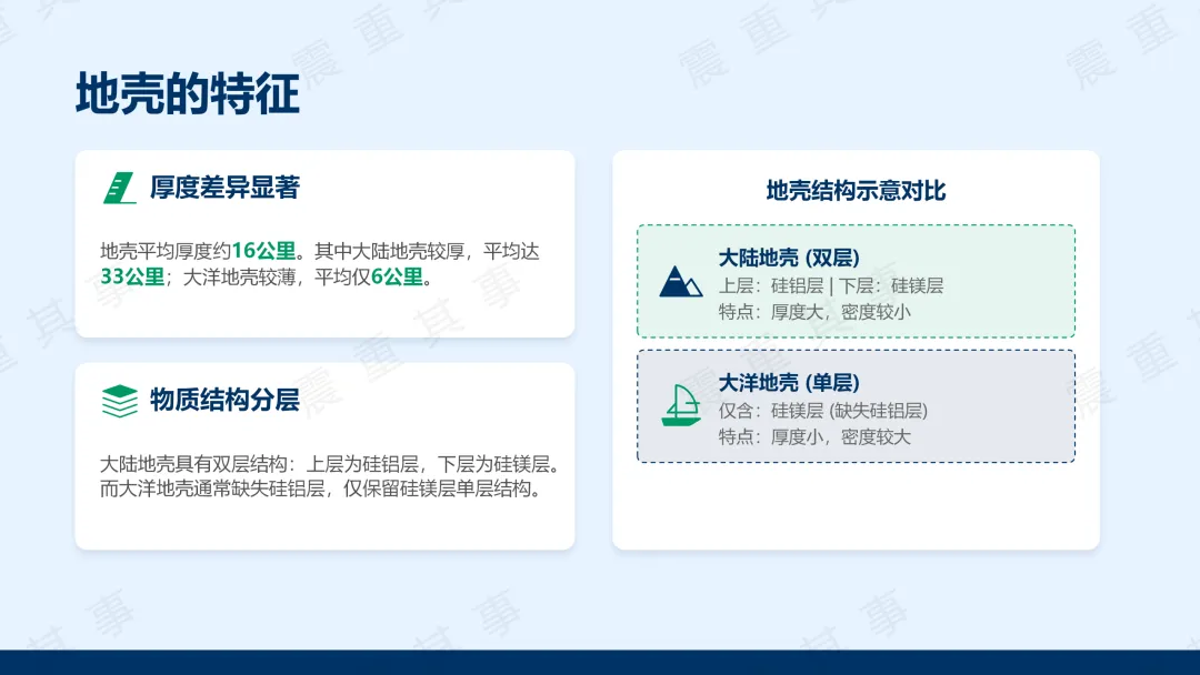 首先我们来认识地壳,它是地球最外层的圈层,第一个特征就是厚度差异非常显著。地壳的平均厚度大约16公里,但是大陆地壳和大洋地壳差别很大:大陆地壳比较厚,平均达到33公里;而大洋地壳非常薄,平均只有6公里,这是地壳最明显的特点之一。