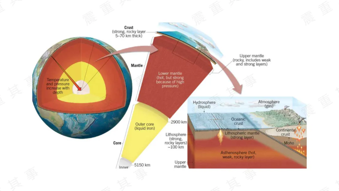 大家看这张图,能更清晰看到各个圈层的深度:从地表到33公里左右的莫霍面,是地壳;从莫霍面到2898公里的古登堡面,是地幔;古登堡面以下到地球球心6370公里的位置,就是地核,地核还能分成外核和内核。